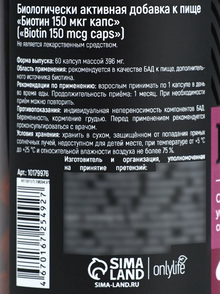 Биотин витамины, стимуляция роста волос, укрепление ногтей и улучшение кожи, 60 капсул. ПРИ ОФОРМЛЕНИИ ЗАКАЗА, ПРОСИМ ЗАПРАШИВАТЬ АКТУАЛЬНЫЕ СРОКИ ГОДНОСТИ У МЕНЕДЖЕРА Состав: микрокристаллическая цел... Показать описаниелюлоза - носитель, желатиновые капсулы (желатин, вода), биотин. Рекомендации по применению : взрослым принимать по 1 капсуле в день во время еды. Продолжительность приема - 1 месяц. При необходимости прием можно повторить. Условия хранения: хранить в защищенном от попадания прямых солнечных лучей и недоступном для детей месте, при температуре от 5 C до 25 С и относительной влажности воздуха не более 75 %, в закрытой неповрежденной упаковке. Срок годности: 24 месяца Предупреждение: БАДы входят в категорию не отказных товаров. Отказ от товара осуществляется только в случае брака.