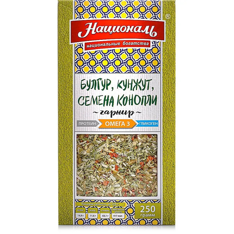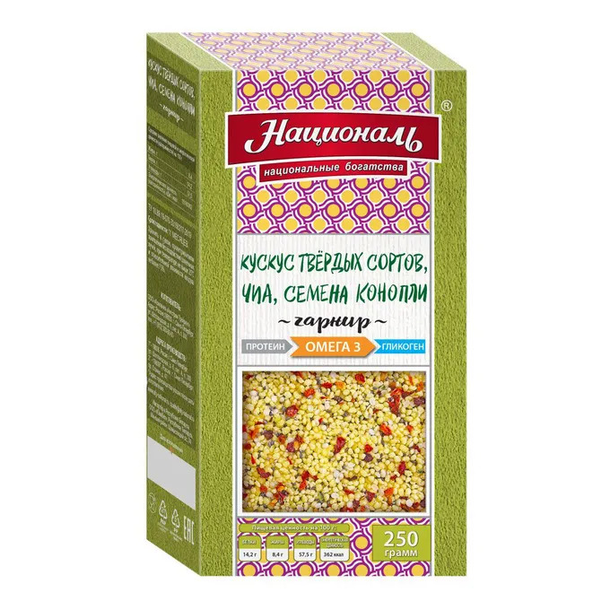 Смесь Националь Кускус, чиа, семена конопли ОМЕГА-3. Кускус, как основа смеси, является прекрасным источником сложных углеводов, которые обеспечивают организм энергией на длительное время. Он также бо... Показать описаниегат клетчаткой, необходимой для здорового пищеварения и поддержания нормального уровня холестерина в крови. Легкий и воздушный кускус отлично сочетается с другими ингредиентами, создавая сбалансированный и питательный продукт. Семена конопли, входящие в состав смеси, являются настоящим кладезем Омега-3 жирных кислот, которые играют важную роль в поддержании здоровья сердечно-сосудистой системы, улучшении когнитивных функций и снижении воспалительных процессов в организме. Кроме того, семена конопли содержат все необходимые аминокислоты, что делает их полноценным источником белка. Сочетание кускуса, чиа и семян конопли в смеси Националь ОМЕГА-3 создает уникальный продукт, который идеально подходит для тех, кто заботится о своем здоровье и стремится к сбалансированному питанию. Эта смесь может быть использована для приготовления разнообразных блюд, от салатов и гарниров до каш и запеканок. Простота приготовления и универсальность смеси позволяют легко включить ее в свой ежедневный рацион, получив максимум пользы для организма. Смесь Националь Кускус, чиа, семена конопли ОМЕГА-3 – это отличный выбор для тех, кто ценит вкус, пользу и удобство в приготовлении пищи.