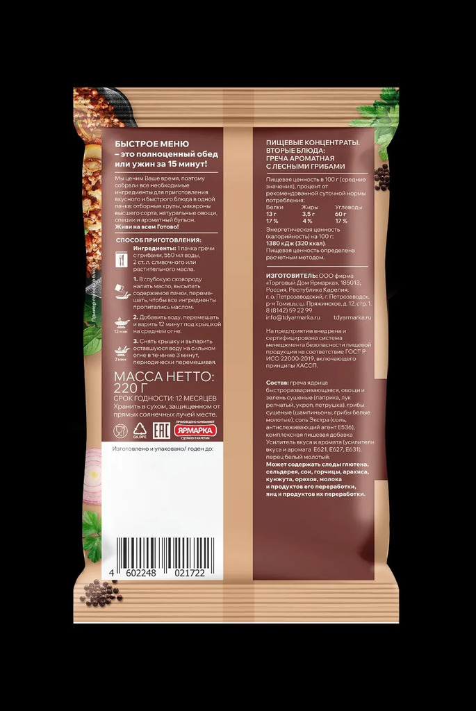 Греча ароматная с лесными грибами, Готово! Это полноценный обед или ужин за 15 минут! Вам не нужно быть шеф-поваром, чтобы насладиться этим изысканным блюдом. В каждой пачке – отборная гречка, впитавш... Показать описаниеая в себя тепло солнца, и щедрая порция лесных грибов, собранных в экологически чистых районах. Мы используем только натуральные ингредиенты, чтобы вы могли ощутить вкус настоящей природы, не тратя часы на поиски и подготовку продуктов. Гречка с грибами – это быстрый и полезный способ насытиться, получив при этом необходимую энергию и витамины. Забудьте о фастфуде и полуфабрикатах – с нашей гречкой вы всегда можете быть уверены в качестве и свежести ингредиентов. Подавайте гречку с грибами горячей, украсив свежей зеленью или добавьте немного сливочного масла для более насыщенного вкуса. Она прекрасно сочетается с овощными салатами и мясными блюдами, но и сама по себе является полноценным и самодостаточным блюдом. Закажите смесь "Греча ароматная с лесными грибами, Готово!" оптом или в розницу с доставкой в Екатеринбурге. Попробуйте и убедитесь сами!