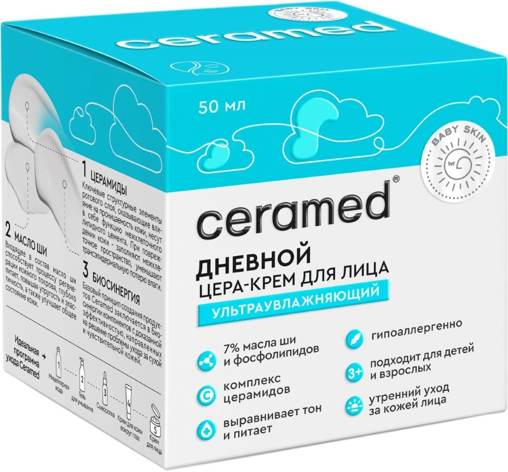 CERAMED - это дерматологический бренд для чувствительной, очень сухой и склонной к раздражению кожи, основанный на ЦЕРАМИДАХ. CERAMED ЦЕРА-КРЕМ ДЛЯ ЛИЦА УЛЬТРАУВЛАЖНЯЮЩИЙ ДЛЯ СУХОЙ ЧУВСТВИТЕЛЬНОЙ /СКЛ... Показать описаниеОННОЙ К РАЗДРАЖЕНИЮ КОЖИ ДЛЯ ДЕТЕЙ И ВЗРОСЛЫХ. Дневной крем для лица «Baby Skin» - одно из базовых средств домашнего ухода за кожей лица. От того, насколько, верно, он подобран, зависит здоровье кожи и ваш комфорт.Масло ши содержит высокий уровень жирных кислот, которые помогают увлажнять и питать кожу, предотвращая ее сухость и шелушение.Дневной цера-крем «Baby Skin» способствует активному увлажнению клеток эпидермиса, улучшает работу естественных увлажнителей, восстанавливает защитный барьер кожи.Активные вещества позволяют улучшить эластичность кожи, активизируют процесс обновления клеток, защищая их от окисления и способствуя синтезу коллагена и эластина.Цера-крем для лица «Baby Skin» защищает кожу от агрессивного воздействия внешних факторов, увлажняет, успокаивает.