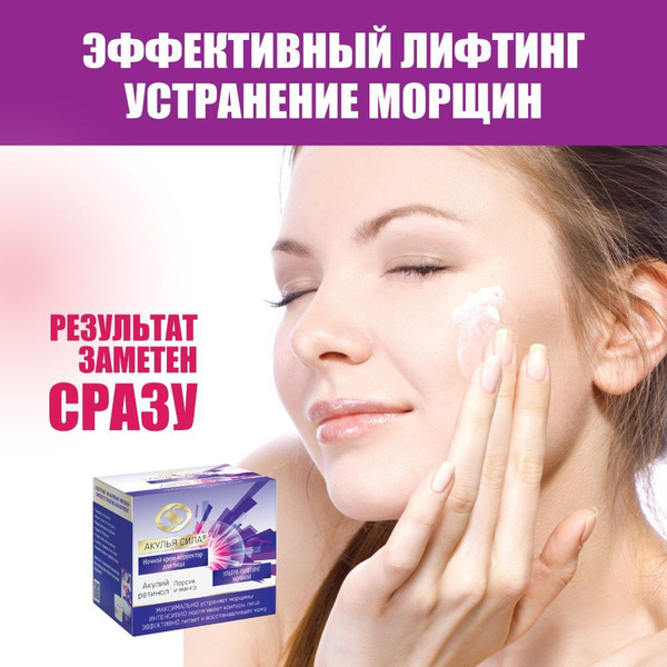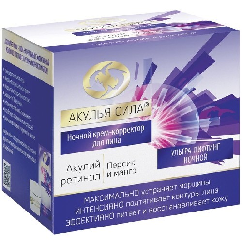 АКУЛИЙ ЖИР АКУЛЬЯ СИЛА ХИТОЗАН С КОЛЛАГЕНОМ НОЧНОЙ КРЕМ ОТ МОРЩИН ДЛЯ ЛИЦА одержит натуральные растительные компоненты и эфирные масла. Внешний вид: Кремовая текстура, приятный цитрусовый запах Ночной... Показать описание крем для лица разработан для ухода за зрелой кожей, для борьбы с морщинами и признаками старения. Активные компоненты крема интенсивно восстанавливают уровень влаги, питают и насыщают кожу кислородом, очищают от токсинов, снимают отечность и усталость, накопившиеся в течение дня. Крем ускоряет регенерацию клеток, способствует выработке собственного коллагена и эластина, разглаживая морщины и замедляя процесс старения. Обладает выраженным подтягивающим эффектом. Результат: Кожа становится более гладкой и бархатистой, а контуры лица - более четкими. ми массирующими движениями до полного впитывания. Показания Ночной уход для лица от морщин. Подтяжка, питание и увлажнение. Противопоказания Индивидуальная непереносимость компонентов продукта. Способ применения и дозы Небольшое количество крема нанести на кожу лица легкими движениями.
