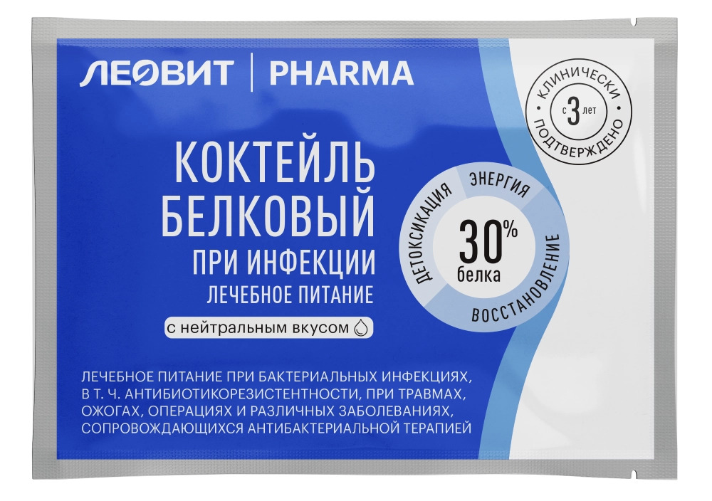 ЛЕОВИТ PHARMA/ФАРМА Коктейль белковый при инфекции с нейтральным вкусом - это специализированное лечебное питание, которое содержит легкоусвояемые белки, жиры, углеводы, витамины, микроэлементы, биоло... Показать описаниегически активные вещества, экстракты лекарственных растений, в том числе природные антибиотики:Прополис обладает антибактериальной, антивирусной, противогрибковой, противовоспалительной, иммуностимулирующей, регенеративной, антиоксидантной активностью. В силу своих антибиотических свойств, прополис оказывает влияние на грамположительные микробы (золотистый стафилококк, дифтерийную и кишечную палочки).Одуванчик оказывает антиоксидантное, противовоспалительное, общеукрепляющее, антивирусное действие.Родиола розовая способствует повышению неспецифической резистентности организма ко многим, но прежде всего к инфекционным заболеваниям. Корень лопуха оказывает противовоспалительное действие.Расторопша обладает противовоспалительным действием, повышает защитные свойства печени по отношению к инфекциям. По данным клинических исследований Коктейль белковый при инфекции рекомендован при бактериальных инфекциях, травмах, ожогах, в пред- и послеоперационный период, при различных заболеваниях, сопровождающихся антибактериальной терапией. Коктейль восполняет дефицит белка и энергии, подавляет рост патогенных микроорганизмов, укрепляет иммунитет, уменьшает воспаление, ускоряет заживление ран, оказывает общеукрепляющее и регенерирующее действие, обладает общетонизирующим, антиоксидантным свойствами, насыщает коферментами, участвующими в выведении и обезвреживании образующихся токсинов, устраняет токсические проявления заболевания. Коктейль белковый при инфекции ЛЕОВИТ PHARMA клинически значимо снижает токсическую нагрузку на организм, что проявляется в уменьшении и устранении симптомов интоксикации (слабость, быструю утомляемость, тошноту, рвоту, расстройства стула) и нормализации биохимических маркеров интоксикации, улучшает функциональное состояние печени при лечении различных заболеваний, включая травмы, термические поражения, оперативные вмешательства, паллиативные состояния, реабилитацию, и др., требующие поддержки антибактериальной терапии. Коктейль белковый при инфекции содержит минимальное количество сахаров, не вызывающих резкого повышения уровня инсулина в крови, а также пищевые волокна, поэтому этот продукт можно принимать при диабете и стрессовой гликемии.Продукт обладает хорошими органолептическими свойствами и не вызывает явлений непереносимости, в т.ч. у лиц с лактазной недостаточностью, и аллергических реакций (по данным клинических исследований). Действие • Восполняет потребность организма в белке и энергии• Оказывает антибиотическое действие, в т.ч. и при антибиотикорезистентности, подавляет рост патогенных и условно-патогенных микроорганизмов, таких как Streptococcus aureus, Streptococcus pneumoniae, Streptococcus viridans, Staphylococcus haemolyticus, Staphylococcus epidirmidis, Pseudomonas aeruginosa, Escherichia coli, Klebsiella pneumonia, Enterococcus durans, Enterobacteriaceae• Снижает количество токсинов, которые продуцируют возбудители бактериальных, вирусных и бактериальных инфекций• Повышает эффективность антибактериальной терапии, не заменяя ее• Снижает токсическую нагрузку на организм и устраняет симптомы интоксикации: тошноту, рвоту, ра