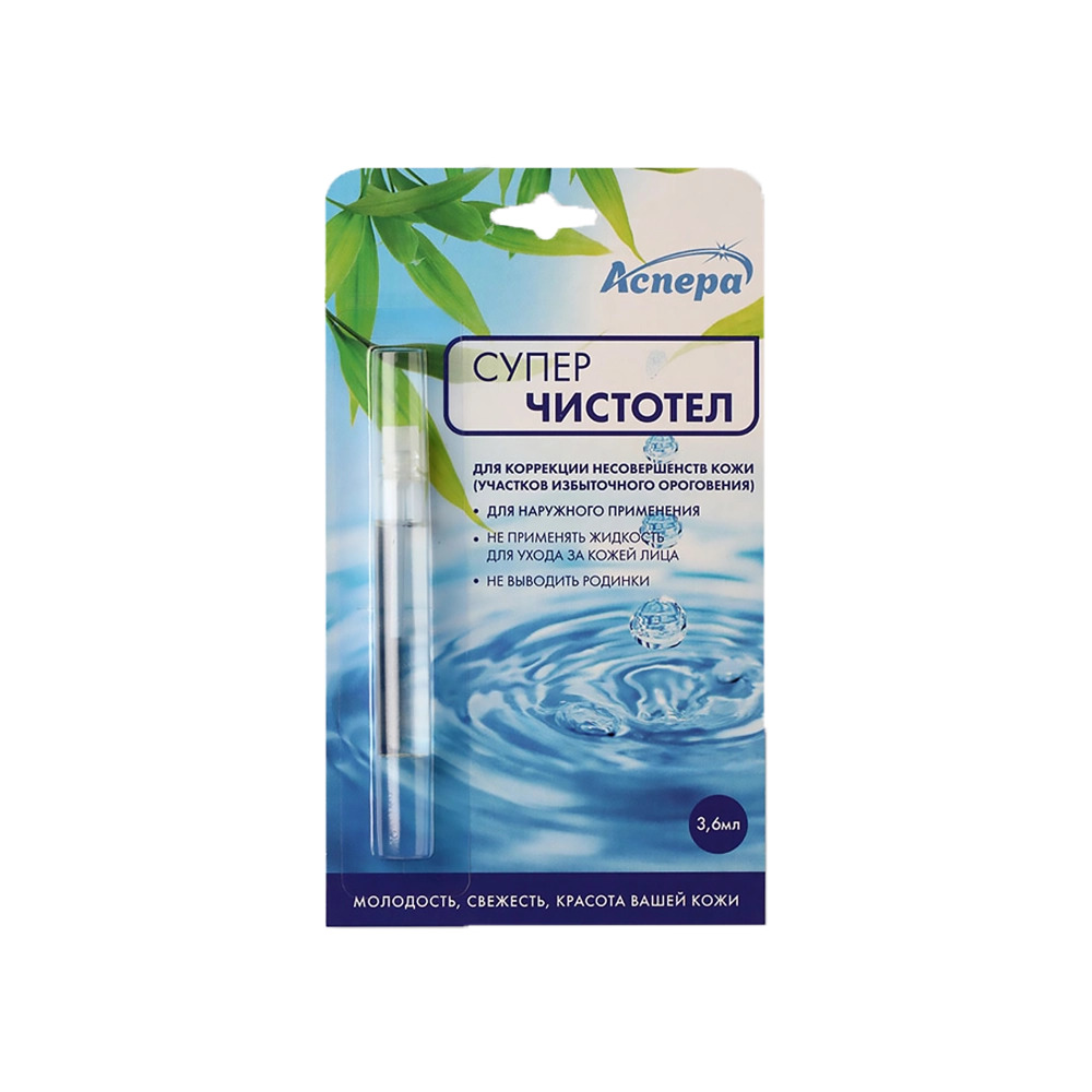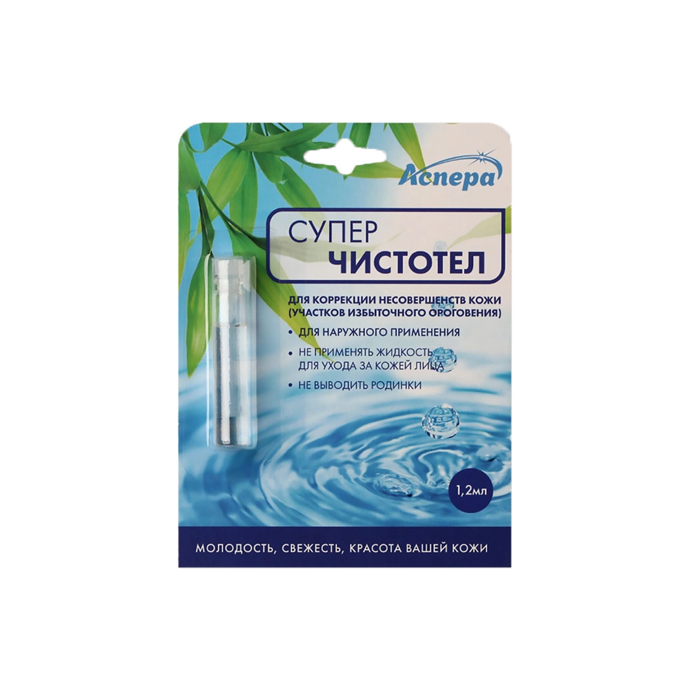 СУПЕРЧИСТОТЕЛ АСПЕРА - косметическая жидкость предназначена для ухода за кожей с избыточным ороговением (бородавки, папилломы, кондиломы)Внешний вид и свойства: прозрачная бесцветная жидкость, при отс... Показать описаниетаивании возможно выпадения естественного осадка Суперчистотел способствует отшелушиванию и удалению кожных образований.Никогда не провоцирует появление новых.Дефекты кожи устраняются практически бесследно. В борьбе с бородавками и папилломами некоторые применяют домашние средства, в частности, используется трава - чистотел.Созвучный ей щелочной препарат - Суперчистотел также борется с этими новообразованиями на коже.Он производится в виде жидкости, которая наносится только на места скопления бородавокВ нем нет экстракта травы - чистотела, но схожесть по действию на кожу имеется, только в отличие от природного лечебного сока, который попадая на кожу, разрушает ее рисунок, препарат восстанавливает его.После применения средства не остается явно видимых следов от папиллом и бородавок.Главные действующие вещества средства создают химический ожог.Соль и сода, содержащие в нем служат нейтрализаторами применяемой щелочи, за счет такой комбинации компонентов средства решаются проблемы с новообразованиями на теле. После использования Суперчистотела бородавки не разрастаются, он купирует этот процесс, а также предупреждает появление новых кожных новообразований.Кроме папиллом его можно применять для сведения мозолей и натоптышей.После нанесения средства на коже происходит химический ожог, который приводит к некрозу ткани, на месте старых деформированных клеток эпидермиса, вырастают новые.Во флаконе с лекарством имеется аппликатор, которым средство доставляется к бородавке и дозируется в виде одной капли.Проведение процедуры зависит от масштабов возникшей проблемы.