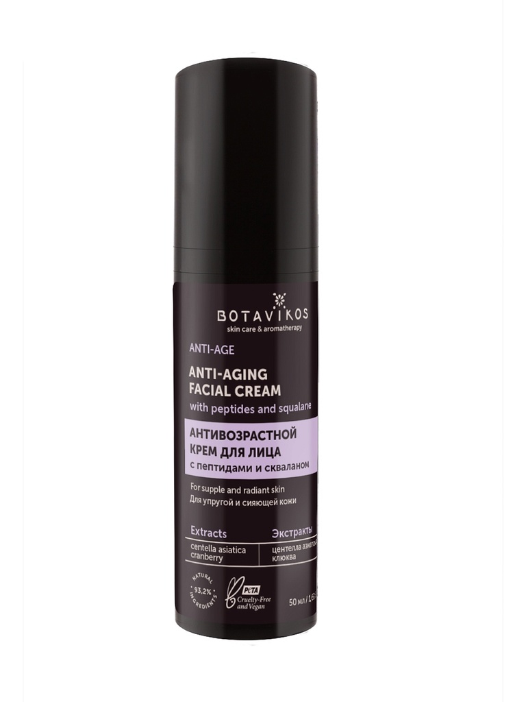 Антивозрастной крем с пептидами и скваланом для упругой и сияющей кожи ANTI-AGE Мультифункциональный крем предназначен для профилактики возрастных изменений и ухода за кожей любого типа. Увлажняет, пи... Показать описаниетает и восстанавливает водный баланс, повышая упругость и эластичность. Благодаря активным компонентам разглаживает кожу, сокращает морщины и возвращает ей сияние. ✔️ Повышает упругость и тонус кожи ✔️ Сокращает количество и глубину морщин ✔️ Интенсивно увлажняет и укрепляет защитный барьер Нейтральный аромат без отдушек — только мягкие натуральные ноты активных компонентов. Активные компоненты: Пептиды — стимулируют выработку коллагена, повышают плотность и эластичность кожи Сквалан — глубоко увлажняет, предотвращает потерю влаги и улучшает барьерные функции Кофеин — способствует уменьшению отечности, тонизирует и освежает кожу Ниацинамид — улучшает оттенок кожи, укрепляет защитный барьер и помогает бороться с возрастными изменениями Экстракт клюквы — мощный антиоксидант, защищает кожу от воздействия свободных радикалов Экстракт центеллы азиатской — успокаивает, ускоряет процессы обновления и поддерживает упругость кожи Антивозрастной крем с пептидами и скваланом для упругой и сияющей кожи ANTI-AGE не содержит силиконов, парабенов, минеральных масел, компонентов животного происхождения, не тестируется на животных. No mineral oil, No silicone, No colorants, NO SLES, no PEG, no parabens, Animal-friendly
