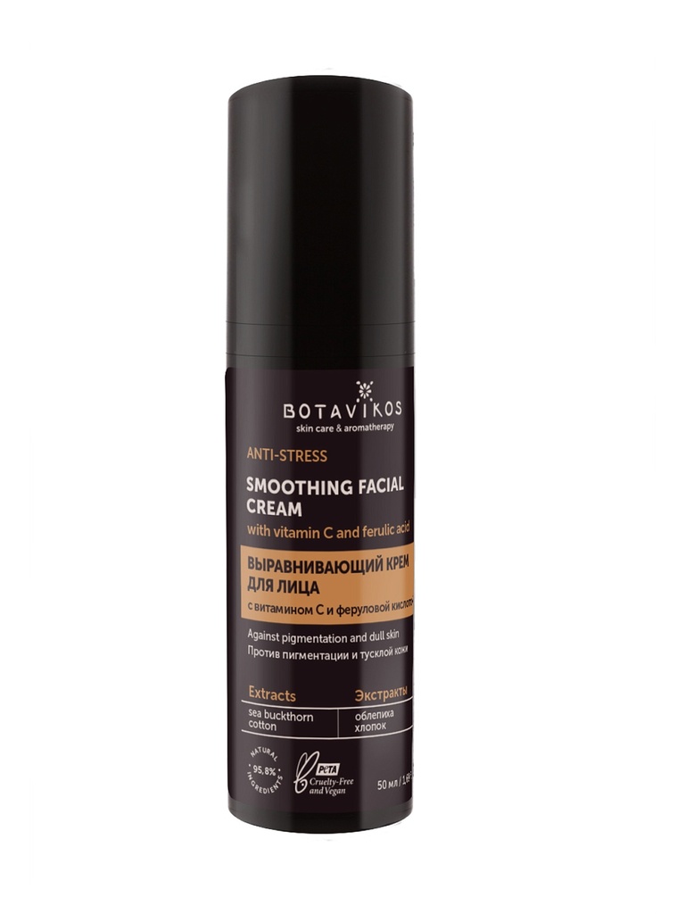 Выравнивающий крем для лица ANTI-STRESS с витамином C и феруловой кислотой помогает устранить пигментацию, возвращает коже сияние, мягкость и ухоженный вид. Подходит для всех типов кожи, особенно при ... Показать описаниетусклом тоне и признаках усталости. ✔️ Выравнивает тон кожи и придаёт здоровое сияние ✔️ Увлажняет, питает и повышает эластичность ✔️ Защищает от оксидативного стресса и помогает предотвратить пигментацию Цитрусовый аромат с теплыми солнечными нотами дарит заряд энергии и улучшает настроение, пробуждая кожу к жизни. Активные компоненты: Витамин C — придаёт коже сияние, осветляет пигментацию, стимулирует выработку коллагена. Феруловая кислота — усиливает действие витамина C, защищает кожу от преждевременного старения. Витамин E — способствует восстановлению кожи, поддерживает увлажнённость, борется со свободными радикалами. Аллантоин — успокаивает, смягчает и способствует регенерации кожи. Экстракт облепихи — насыщает кожу витаминами и жирными кислотами, улучшает эластичность. Экстракт хлопка — увлажняет и придаёт коже бархатистость. Выравнивающий крем для лица ANTI-STRESS не содержит силиконов, парабенов, минеральных масел, компонентов животного происхождения, не тестируется на животных. No mineral oil, No silicone, No colorants, NO SLES, no PEG, no parabens, Animal-friendly.