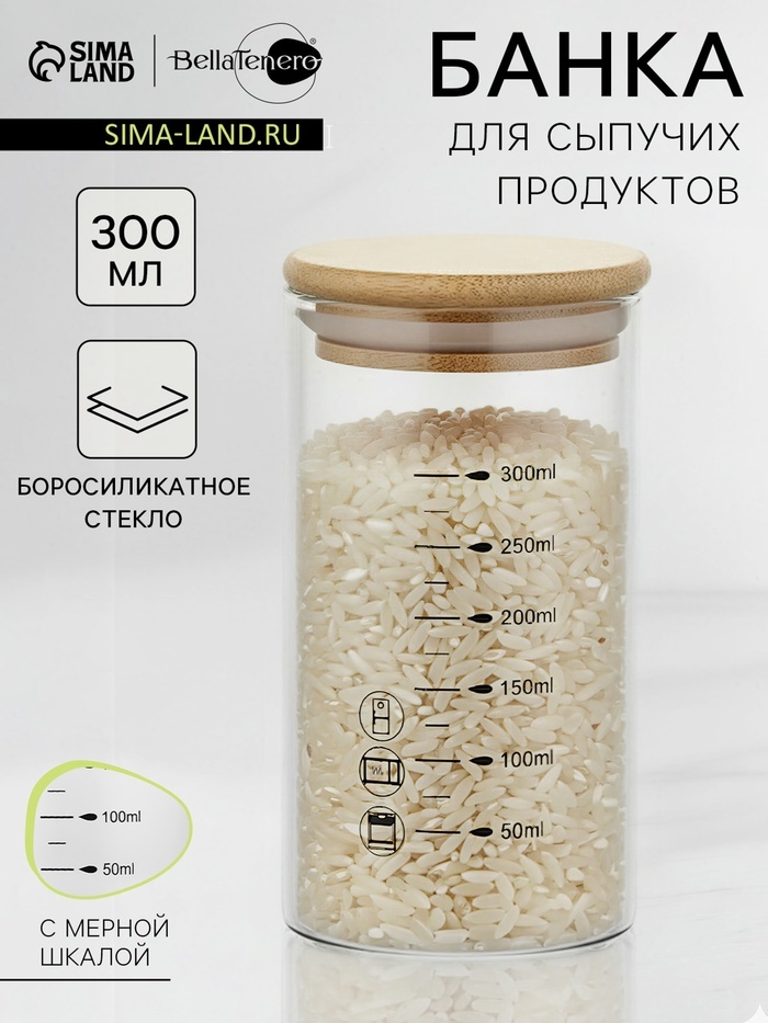 Банка для сыпучих BellaTenero «Эко», 300 мл, 6.7?13.7 см, с мерной шкалой, с бамбуковой крышкой, стекло, прозрачнаяВопросы по товару