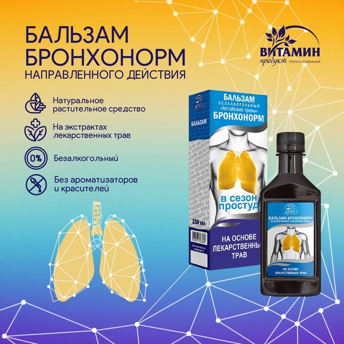 Эта растительная композиция дает возможность организму справиться при заболеваниях бронхо-легочной системы в качестве дополнительного средства, благотворно влияющего на состояние легких и бронхов, исп... Показать описаниеользуется для профилактики осложнений при простуде и гриппе. Способ употребления: взрослым по 2 ч.л. 3 раза в день во время еды. Противопоказания: индивидуальная непереносимость компонентов, беременность, кормление грудью, нарушения углеводного обмена. Перед применением рекомендуется проконсультироваться с врачом. Состав: водный экстракт из смеси растительного сырья (корней дягиля лекарственного, корней солодки голой, листьев подорожника большого, травы чабреца, плодов шиповника майского, плодов боярышника кроваво-красного, листьев мать -и мачехи, травы горца птичьего (спорыша)). Вспомогательные компоненты: сахар, регулятор кислотности – лимонная кислота (Е330), консервант – сорбат калия (Е202).