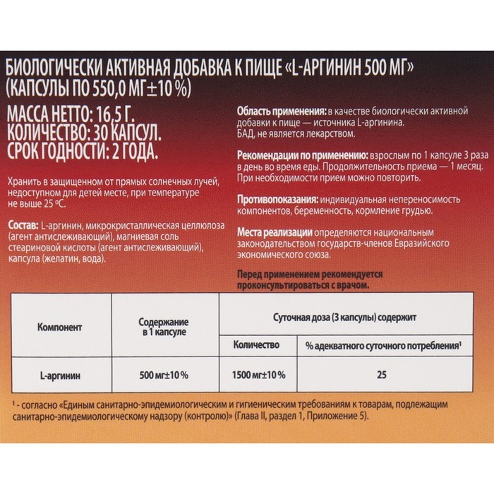 L-аргинин 500 мг - это добавка к питанию, которая содержит аминокислоту L-аргинин, необходимую для правильного функционирования иммунной и сердечно-сосудистой системы. Каждая капсула массой 550 мг сод... Показать описаниеержит 500 мг L-аргинина и добавки для облегчения его усвоения. В упаковке 30 капсул. Этот продукт может быть особенно полезен для людей, занимающихся физической активностью, а также для тех, кто хочет поддерживать здоровое сердце и сосуды. Л-аргинин может также помочь уменьшить уровень стресса и повысить энергию и выносливость. Рекомендуется принимать по 1 капсуле в день во время еды в качестве дополнения к питанию. Способ применения и дозы: Перед применением рекомендуется проконсультироваться с врачом. Способ применения и дозы: взрослым по 1 капсуле 3 раза в день во время еды. Продолжительность приема - 1 месяц. При необходимости прием можно повторить. Показания: в качестве биологически активной добавки к пище - источника L-аргинина. Противопоказания: индивидуальная непереносимость компонентов, бере- менность, кормление грудью. Особые указания: Биологически активная добавка к пище. Не является лекарством. Перед применением необходимо проконсультироваться с врачом.