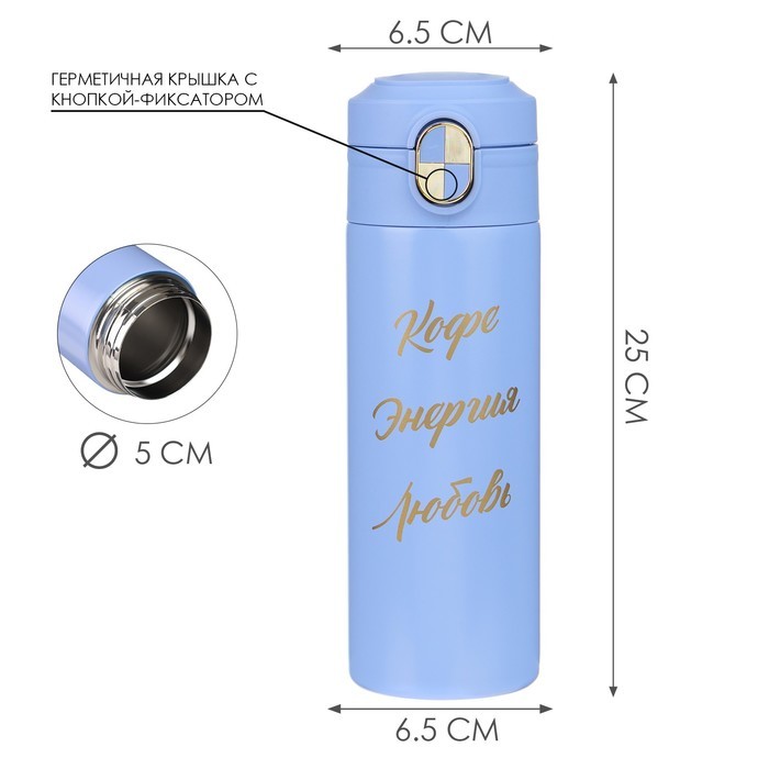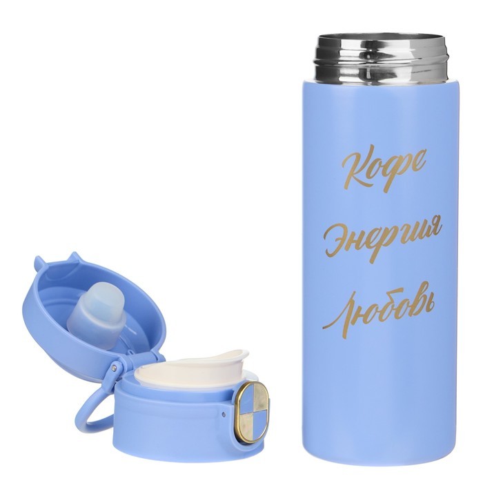 Термокружка для кофе и чая "Кофе - энергия - любовь" идеальна для офиса, автомобиля, длительных прогулок и детям в школу. Благодаря специальному покрытию надежно лежит в руке. Термокружка - это стильн... Показать описаниеый аксессуар и отличный подарок на новый год, другу, подруге, брату, сестре, девушке, папе, маме, мужу, жене, бабушке и дедушке на день рождения, 23 февраля, 8 марта, 14 февраля. Термокружка сделана из нержавеющей стали марки 304, сконструирована по вакуумной технологии, с двойной стенкой, следовательно, долго держит тепло и не проливается. Оснащена откидывающейся крышкой, изготовленной из экологичного пищевого пластика. На дне термокружка имеет специальную прорезиненную основу, предотвращающую царапины на поверхностях. Особенности: * Можно открывать и закрывать одной рукой * Удобное горлышко (поильник) * Нескользящее дно * Ставится в автомобильный подстаканник * Открывается с помощью нажатия * 100% защита от протекания * Стильный дизайн, приятна на ощупь * Сохраняет тепло или холод до 8 часов * Двойные стенки из нержавеющей стали Перед первым применением обдайте внутреннюю колбу кипятком. После того, как нальёте горячий напиток, через несколько секунд откройте кружку, выпустите пар и снова закройте. Так напиток дольше сохранит температуру. Нельзя мыть в посудомоечной машине и нагревать в микроволновой печи.