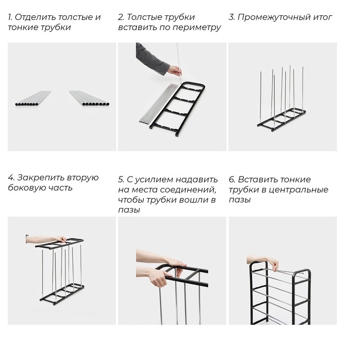 Превратите вашу прихожую в аккуратное и организованное пространство с Обувницей Доляна. Эта стильная и функциональная полка для обуви поможет вам навсегда забыть&nbs... Показать описаниеp;о беспорядке. С четырьмя ярусами и компактными размерами (42Г—19Г—60 см), она идеально впишется даже в небольшие помещения. Эта обувница изготовлена из высококачественного металла с антикоррозийным полимерным покрытием, что обеспечивает её долговечность и устойчивость. Её чёрный цвет добавит элегантности и современности вашему интерьеру. Прочные металлические прутья и легкий вес делают её удобной в использовании, так что даже хрупкая женщина сможет легко перемещать полку при необходимости. * Эффективное использование пространства: Компактные размеры позволяют экономить место и поддерживать порядок в прихожей. * Прочность и долговечность: Металлическая конструкция с антикоррозийным покрытием обеспечивает долгий срок службы и устойчивость к повреждениям. * Лёгкость и удобство: Лёгкий вес конструкции позволяет легко перемещать её в нужное место. * Универсальное хранение: Подходит для всех типов обуви, не мнут обувь и обеспечивают их проветривание. * Эстетичность: Современный дизайн и классический чёрный цвет добавят стиль вашему интерьеру. Обувница Доляна поставляется в разобранном виде, что облегчает её транспортировку и сборку. Выбирая эту полку, вы получаете надёжного помощника для хранения обуви, который будет радовать вас своим качеством и функциональностью. Приобретайте обувницу Доляна и наслаждайтесь порядком и комфортом в вашем доме! Комплектация Край стойки - 2 шт; Тонкие прутья - 8 шт; Толстые прутья - 8 шт. Дополнительно Перед тем как приступить к сборке обувницы, убедитесь, что трубы правильно разделены по размеру. Большие трубы должны быть установлены внизу, а меньшие — вверху. Это обеспечит надёжность и устойчивость конструкции.