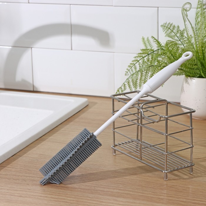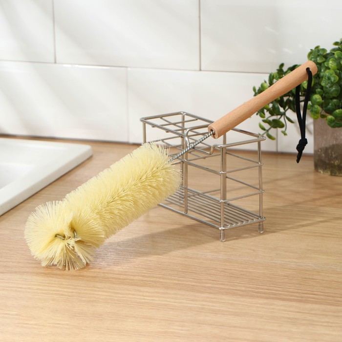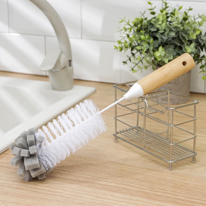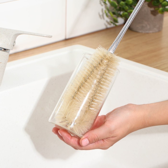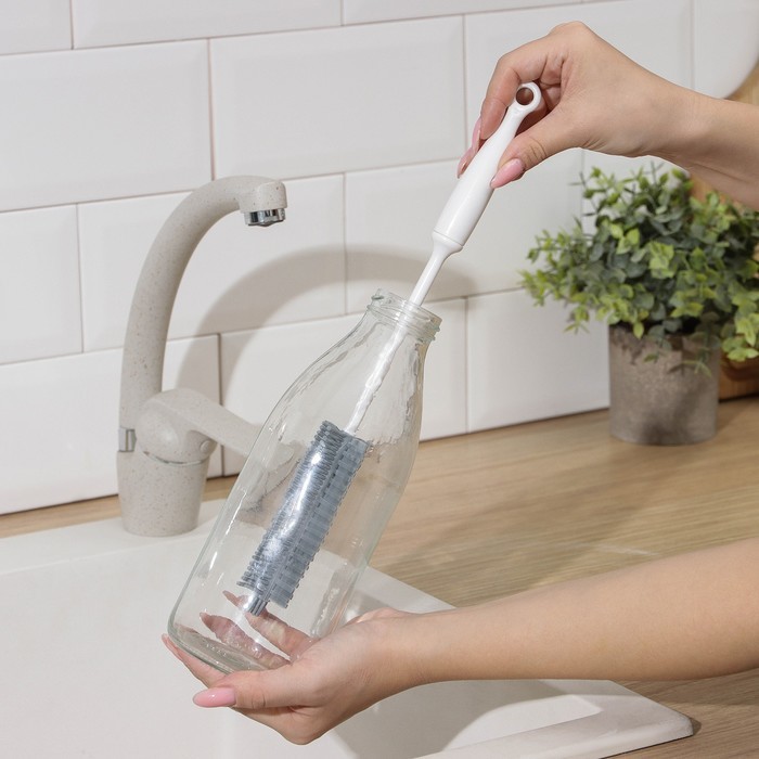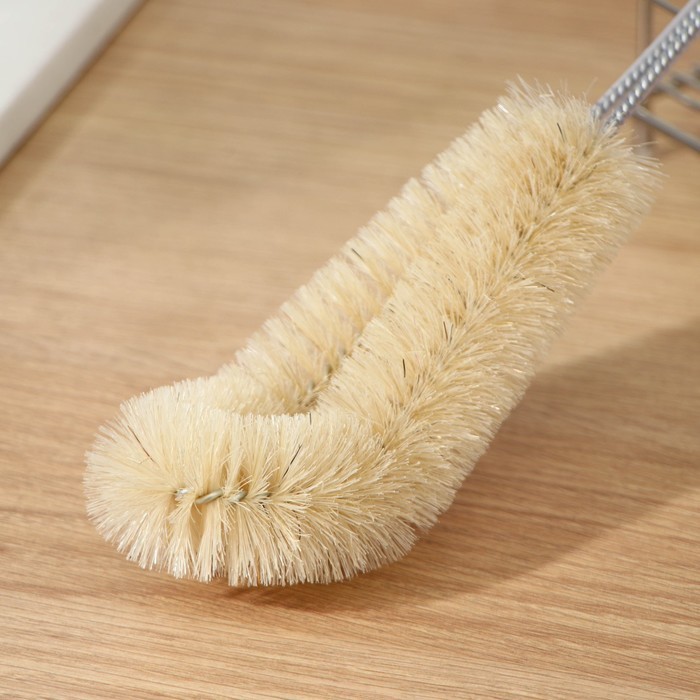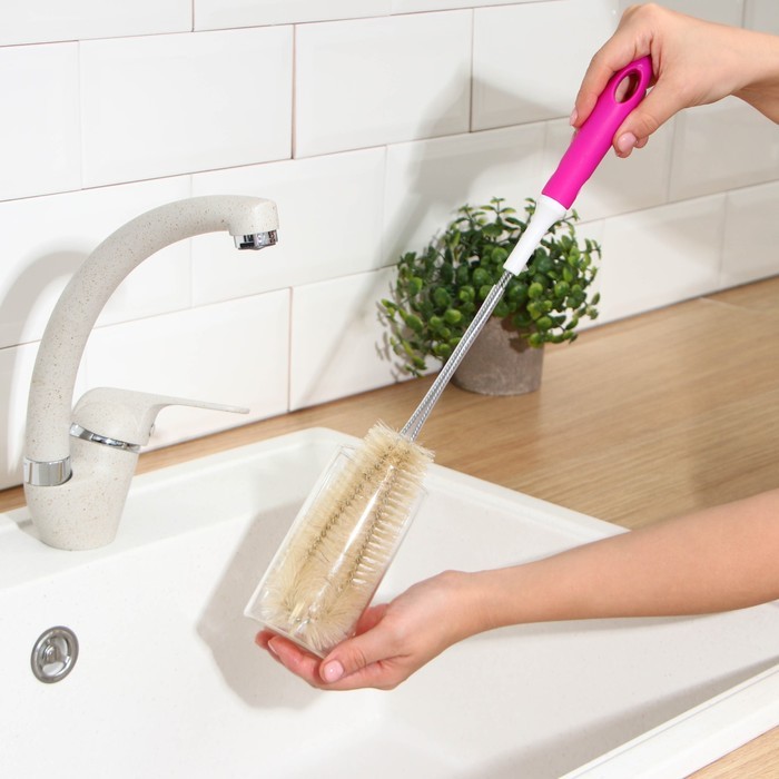 Бутылочный ёрш – необходимый предмет на кухне каждой хозяйки. Преимущества: * Кухонный ёрш подходит для мытья посуды, детских бутылочек, сосок, банок, колб кальянов, ваз, кувшинов, чайников, бутылок, ... Показать описаниетермосов, стаканов, графинов и прочей глубокой посуды с узким горлышком. * Ёршик имеет удобную тонкую ручку и отверстие для подвешивания, можно хранить в подвешенном положении. * Благодаря изогнутой форме убирает загрязнения в самых труднодоступных местах. * Жесткая прочная щетина долго служит, не изнашивается. Дополнительно Ёршику для посуды с губкой Доляна требуется минимальный уход: * После использования промойте ёршик тёплой водой с мягким моющим средством. * Не используйте абразивные чистящие средства или металлические губки, так как они могут повредить щетину. * Тщательно просушите ёршик после мытья, чтобы предотвратить образование плесени и бактерий. * Храните ёршик в сухом месте, желательно в подвешенном состоянии, чтобы избежать деформации и сохранить форму.