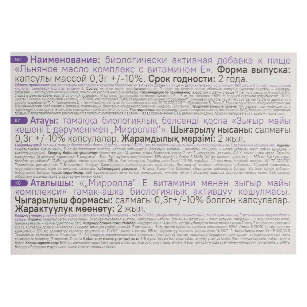 БАД Масло льняное Мирролла, 100 капсул – это дополнительный источник Омега 3 жирных кислот и витамина Е из натуральных природных компонентов. Омега-3 способствует поддержанию эластичности сосудов и но... Показать описаниермального уровня холестерина, снижает воспалительные процессы в организме, благотворно влияет на мозг и нормализует обмен веществ. Витамин Е помогает бороться с окислительным стрессом, комплексно поддерживает здоровье кожи, волос и ногтей, питая их на клеточном уровне. Небольшие капсулы легко проглатываются, а упаковки препарата хватает на курс приема длительностью 25 дней. Для детей от 14 лет и взрослых.