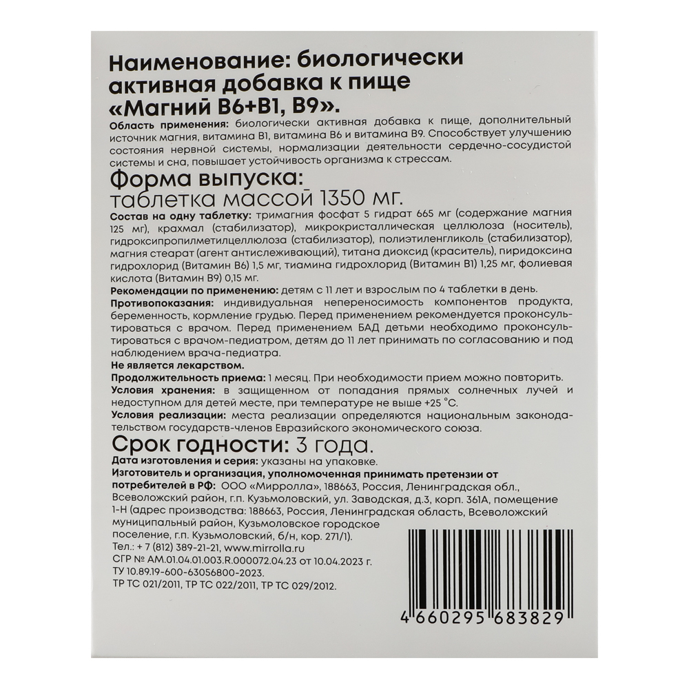 БАД "Магний B6+B1, B9" Мирролла, 30 таблеток способствует улучшению состояния нервной системы, повышает устойчивость организма к стрессам и борется с дефицитом магния и витаминов группы B. Магний в со... Показать описаниечетании с витаминами B1, B6 и фолиевой кислотой B9 поддерживает когнитивные функции и эмоциональное равновесие, улучшает концентрацию внимания, нормализует кровяное давление. Комплекс способствует снижению усталости и раздражительности и помогает поддерживать эмоциональное равновесие.