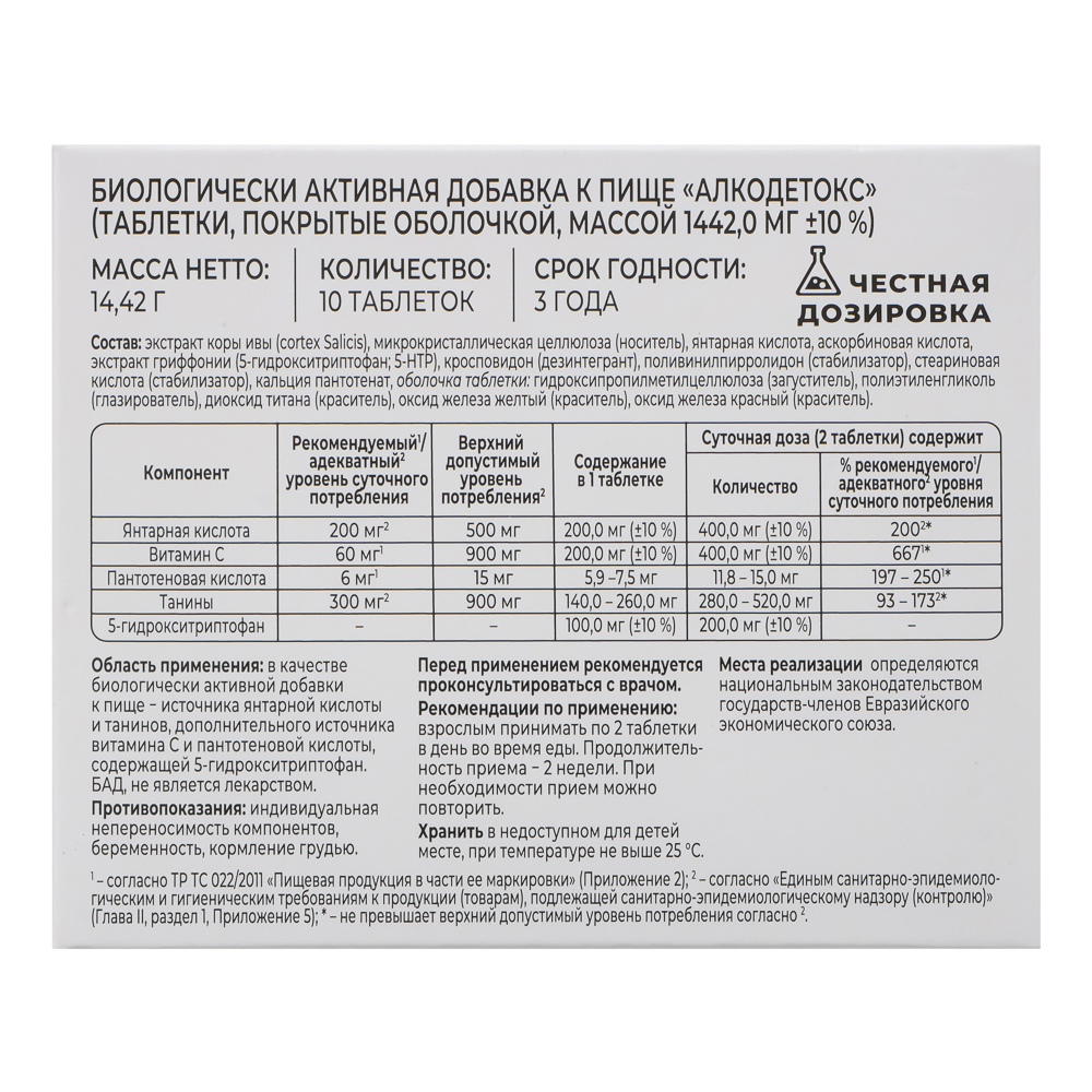 БАД «Алкодетокс» Витамир Vitaworld, комплекс от похмелья с янтарной кислотой, 10 таблеток, для взрослых – это специально разработанная формула, которая помогает быстро вернуть бодрость и ясность ума, ... Показать описаниеподдерживает естественные процессы детоксикации, помогая организму справиться с последствиями употребления алкоголя. Активные компоненты: 5-HTP, янтарная кислота, экстракт корней ивы, аскорбиновая кислота. 5-гидрокситриптофан способствует улучшению общего самочувствия и устранению чувства тревоги. Янтарная кислота способствует быстрой переработке алкоголя и выведению его метаболитов из организма. Кора ивы оказывает детокс-эффект и защищает нервную систему, а аскорбиновая кислота предотвращает окислительный стресс, развивающийся в результате токсического действия алкоголя. Комплекс действует быстро и эффективно.