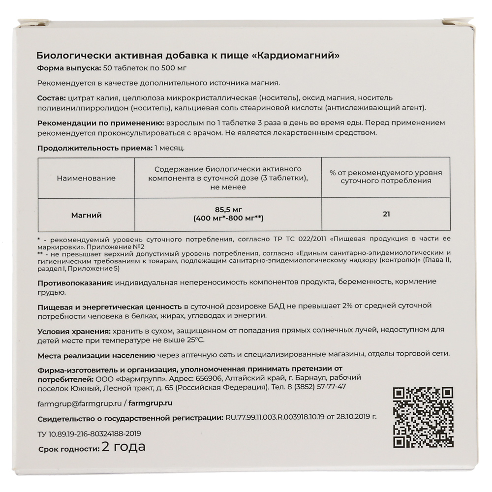 Кардио Калий-Магний – это эффективный комплекс для поддержания здоровья сердечно-сосудистой системы. В одной упаковке содержится 50 таблеток по 0,5 г каждая. Комплекс включает в себя важные минералы к... Показать описаниеалий и магний, которые играют ключевую роль в поддержании нормальной работы сердца и сосудов. Калий помогает регулировать водно-солевой баланс, а магний способствует расслаблению сосудов и снижению артериального давления. Рекомендованный курс приема и дозировка уточняются у врача. Кардио Калий-Магний помогает поддерживать здоровье сердца и сосудов, улучшая общее самочувствие и предотвращая возможные нарушения в работе сердечно-сосудистой системы.