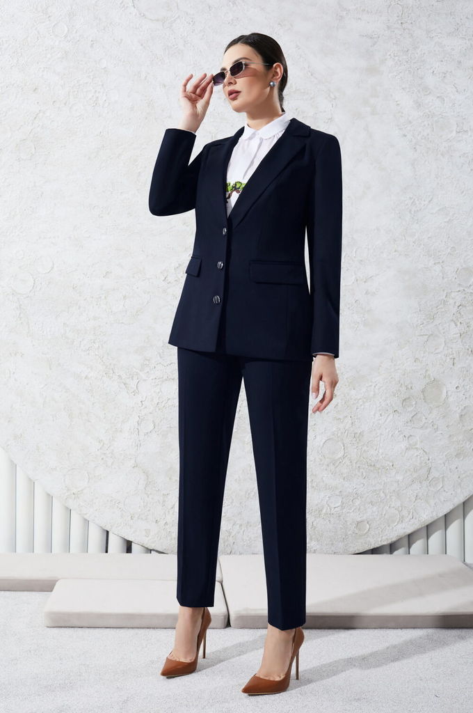 Состав: Костюм: Вискоза-32%; ПЭ-65%; Эластан-3%; Блуза: ПЭ-жоржет%; Костюм брючный Жакет со стояче отложным воротником и центральной застёжкой на петли и пуговицы. Перед с карманами с клапанами в ниж... Показать описаниеней части. Спинка со средним швом и двумя рельефами. Рукава втачные. Жакет на подкладке. Блузка со стояче отложным воротником, центральной застёжкой на петли, потайные пуговицы и одну декоративную пуговицу. Перед с вышивкой по центру. Спинка с отрезной кокеткой. Рукава втачные, с манжетами и с застёжкой на петли и пуговицы по низу. Брюки на притачном поясе. ВОЗМОЖНА ЗАМЕНА ФУРНИТУРЫ НА АНАЛОГИЧНУЮ ТАКОГО ЖЕ КАЧЕСТВА. Замеры 44-46-48: Жакет Длина спинки 68.5 см. Ширина изделия на уровне глубины проймы 95 99 103см. Ширина изделия по линии бёдер 102 106 110 см. Длина рукава 61.5 см. Ширина рукава на уровне глубины проймы 33 35 37 см. Ширина плеча 12.5см. Брюки Длина брюк по боковому шву 100 см. Длина брюк по шаговому шву 76.5 см. Ширина брюк по линии талии 75 79 83 см. Ширина брюк по линии бедер 95 99 103 см. Ширина брюк по низу 34 34 34 см. Блузка Длина спинки 62.5 см. Ширина блузки на уровне глубины проймы 101 105 109 см. Ширина блузки по линии бёдер 103 107 111см. Длина рукава 61.5 см. Ширина рукава на уровне глубины проймы 33.5 35.5 37.5 см. Ширина плеча 11.5 см.