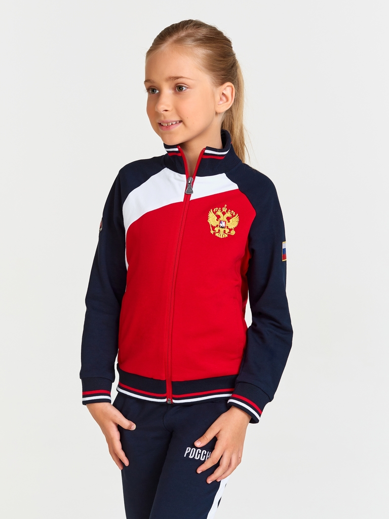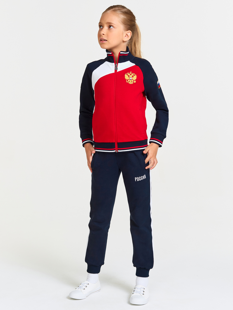 Тип материала: футер двухниточный ? Футер двухниточный с эластаном — это высококачественное смесовое хлопчатобумажное трикотажное полотно. Это полотно преимущественно состоит из хлопка. Также может со... Показать описаниедержать до 25% эластана и полиэстра. Такой состав и особая технология плетения позволяют достичь прочности и формоустойчивости полотна, при этом оно сохраняет легкость и воздухопроницаемость хлопка и хорошо растягивается в двух направлениях. Спортивные изделия из такого полотна очень функциональные, поддерживают широкую амплитуду движений, что очень важно для использования этой одежды для занятий фитнесом, пилатесом и йогой. Спортивный костюм выполнен из хлопкового трикотажного полотна. Куртка с воротником на молнии. Низ куртки, рукавов и воротник из эластичного трикотажа с полосами. Спереди на куртке - контрастные вставки в цвет российского флага. карманы куртки в рельефах. На груди куртки слева - вышивка российского герба, на левом рукаве - шеврон российского флага. Брюки с контрастными боковыми вставками. Низ брюк с манжетами. Карманы брюк прорезные . слева под карманом - вышивка Россия. Пояс брюк дополнительно фиксируется шнуром