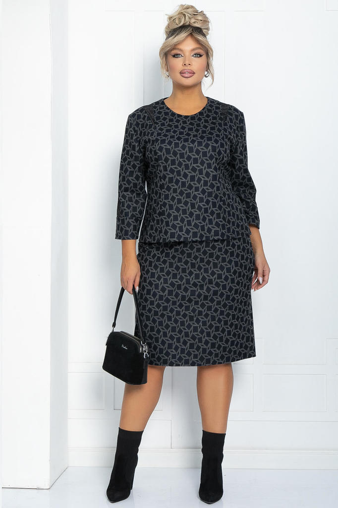 Артикул: К12603-25. Тип ткани: синтетическая. Состав: 95% полиэстер, 5% спандекс. Материал: трикотаж "Жаккард". Цвет: тёмно-серый. Принт: отсутствует. Вид застежки: пуговица на джемпере и мо... Показать описаниелния на юбке. Резинка в поясе: отсутствует. Карманы: отсутствуют. Силуэт: приталенный. Декоративные элементы: отсутствуют. Длина верха: 44-46/ 58 см, 48/ 59 см, 50/ 60 см. Длина юбки: 44/ 73 см, 46-50/ 74 см. Размер изделия на модели: 44 Рост модели: 168 см. Комплект из джемпера и юбки — это универсальное сочетание для создания как повседневных, так и более формальных образов. Юбка с застёжкой-молнией и разрезом сзади обеспечивает свободу движений. Джемпер придаёт образу элегантности и шарма. Уход за изделием: ручная стирка до 30 градусов; нельзя отбеливать; отжим запрещён; гладить при t не более 110 С; гладить с изнанки. Внимание! Рекомендуем ориентироваться на размерную сетку и выбирать свой привычный размер, согласно размерной таблице. *Допуск отклонения длины при массовом производстве 1-3 см является нормой.