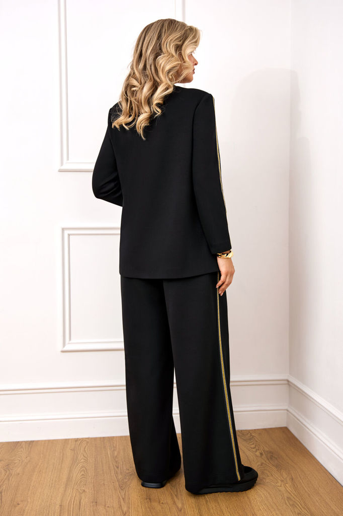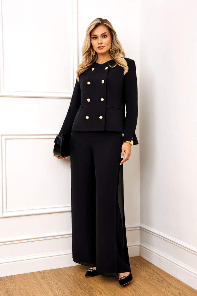 Состав: Вискоза-32%; ПЭ-65%; Спандекс-3%; Стильный и супер эффектный костюм, состоит из жакета и брюк. Жакет полуприлегающего силуэта, выполнен из премиальной ткани Зара с добавлением вискозы. Жакет д... Показать описаниевубортный, по переду с застежкой на металлические золотые пуговицы и V-образным вырезом горловины, что придает модели особый шарм и нарядность! Жакет полностью на премиальной подкладке GRAND. Рукав жакета втачной, полной длины, с небольшим разрезом по низу! Брюки — это отдельный вид искусства! Брюки прямого силуэта, выполнены из ткани Зара с добавлением вискозы, верхний слой брюк выполнен из летящего шифона, что придает модели особый стиль и нарядность. Брюки сбоку с застежкой на потайную молнию и пуговицы. Модель идеально украсит праздничный образ, но в тоже время прекрасно подойдет для ежедневной носки! В данном костюме вы будете ЛЕДИ на МИЛЛИОН!