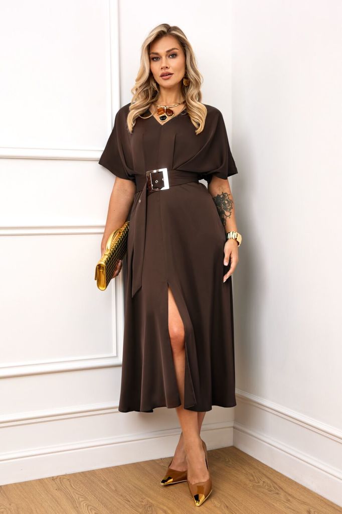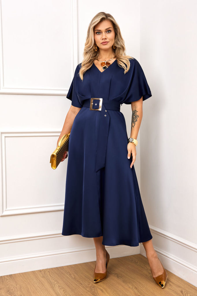 Состав: Вискоза-32%; ПЭ-65%; Эластан-3%; Элегантное нарядное платье, выполнено из роскошной струящейся плательной ткани с добавлением вискозы. Платье с V-образным вырезом горловины, отрезное по линии ... Показать описаниеталии. Верхняя часть платья выполнена в свободном стиле со спущенной линией плеча и глубокими складками на линии талии, что придает платью особый стиль и шарм. Юбка платья с расклешением, по переду с разрезом. В боковом шве платья потайная молния застежка. Рукав цельнокроеный, объёмный, со спущенной линией плеча. В комплекте к платью идет съемный пояс с шикарной золотой пряжкой. Модель удобная и практичная, вы будете в нем выглядеть неотразимо и нарядно.