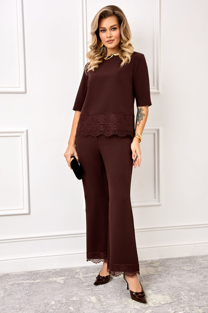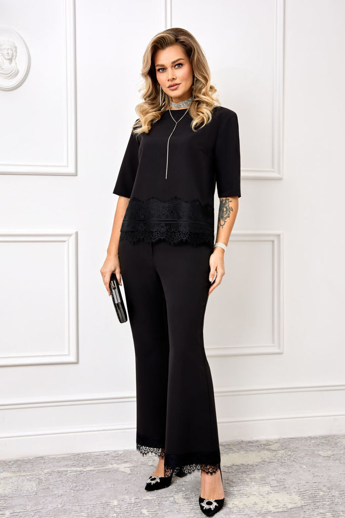 Состав: Вискоза-32%; ПЭ-65%; Эластан-3%; Стильный и невероятно удобный комплект, состоит из блузы и брюк. Блуза прямого силуэта, выполнена из ткани Барби с добавлением вискозы. Низ блузы декорирован ф... Показать описаниеранцузским кружевом, по спинке с застежкой на молнию. Рукав втачной, слегка спущенный. Брюки на поясе, по спинке с резинкой, спереди с застежкой на молнию и пуговицу. Брюки модного в этом сезоне силуэта, слегка заужены в области колена и расклешены к низу. Низ брюк декорирован французским кружевом.