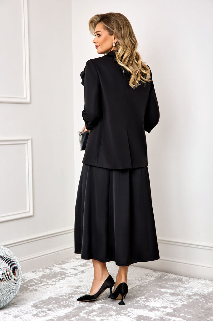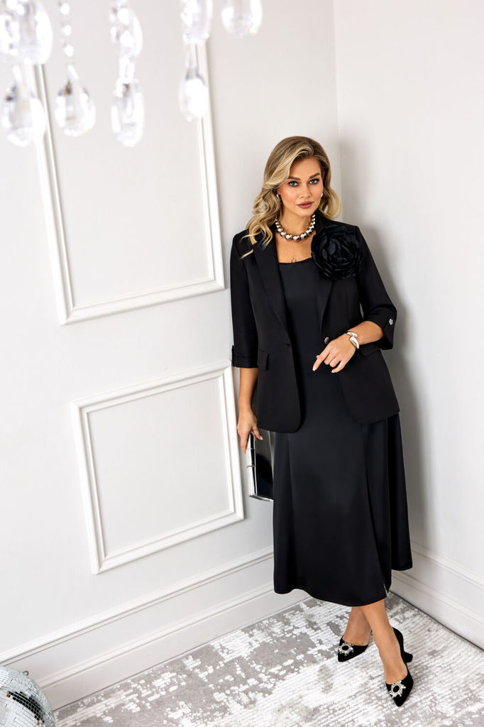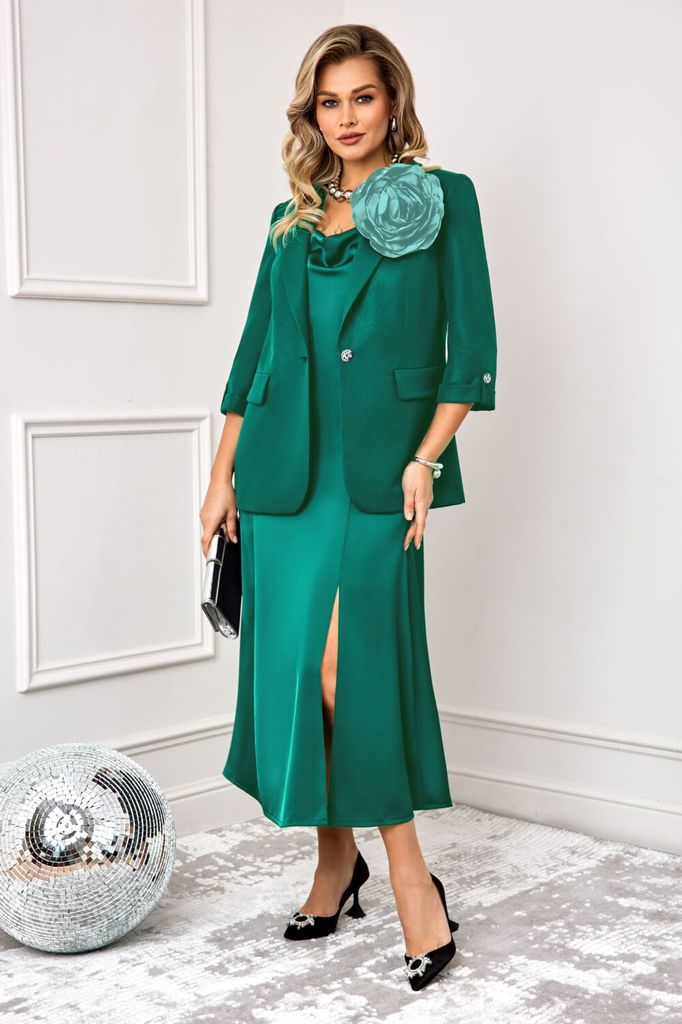 Состав: Вискоза-32%; ПЭ-65%; Эластан-3%; Элегантный и нарядный комплект, состоит из жакета и платья. Жакет прямого силуэта, выполнен из Ткани Барби с добавлением вискозы, полностью на подкладке. Жакет... Показать описаниеа по переду с застежкой на пуговицу, функциональными карманами с клапанами. Рукав втачной, длиной ?, с манжетой и патой с застежкой на пуговицу. Спинка жакета по низу со шлицей. Жакет декорирован съемным украшением в виде банта ручной работы. Платье А-силуэта, выполнено из атласной ткани с добавляем вискозы. Платье на бретелях, спереди с разрезом, что придает модели особый шарм. Модель удобная и практичная, отлично подойдет для ежедневной носки и торжественного мероприятия.