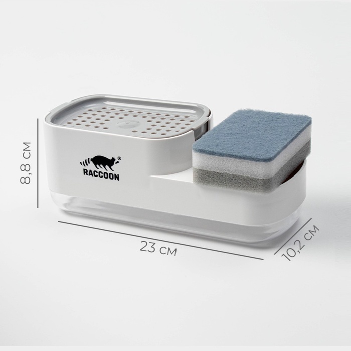 Дозатор для моющего средства с подставкой для губки Raccoon, 550 мл, губка в комплекте, белыйВопросы по товару