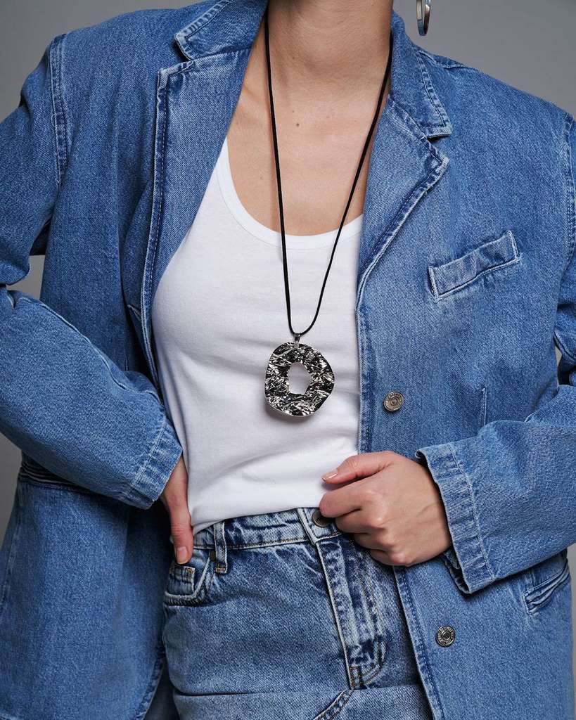 Длинное колье с круглой подвеской, выполненное из бижутерного сплава высокого качества, привлекает внимание своим современным и стильным дизайном. Текстура застывшей лавы на крупной круглой подвеске с... Показать описаниеоздаст необычный акцент в любом образе. Глянцевый серебристый металл придает изделию загадочность и элегантность, делая его универсальным аксессуаром для разных мероприятий. Длина матинэ в 45 см идеально сочетается с замшевым шнурком, обеспечивая комфортную посадку колье на шее. Это колье с крупным кулоном станет замечательным выбором для тех, кто ценит минимализм и оригинальный дизайн. Крупная круглая подвеска привлекает взгляды и придает дерзости, а также отлично смотрится как в повседневном, так и в вечернем образе. Дизайнеры, создававшие украшение, акцентировали внимание на контрасте между глянцевой поверхностью и фактурой подвески, благодаря этому, колье будет великолепно смотреться как в солнечный день, так и при искусственном освещении, добавляя изюминку любому наряду. Состав: Нержавеющая сталь / Искуственная замша