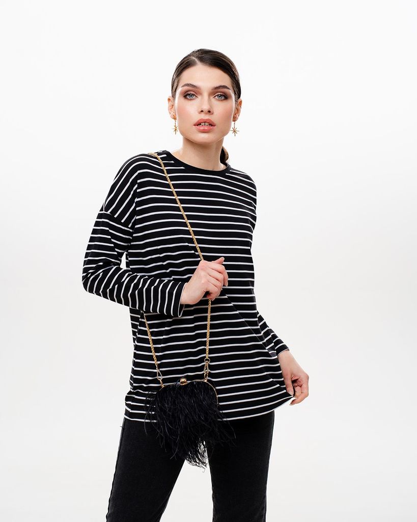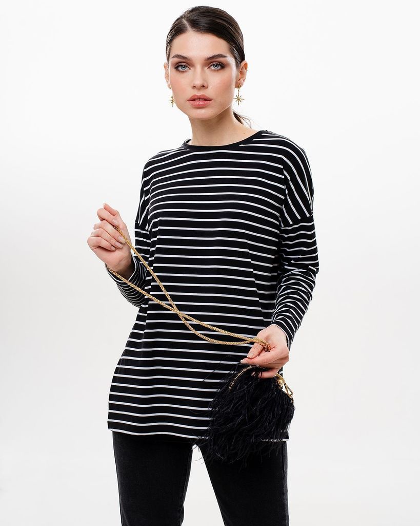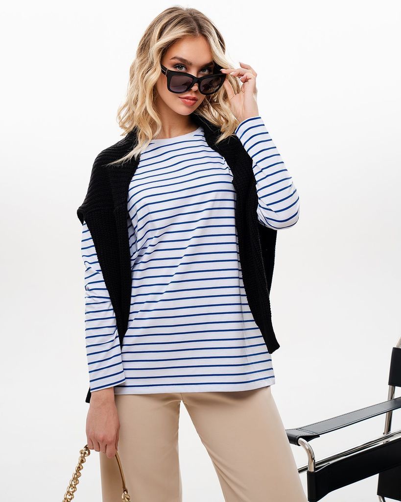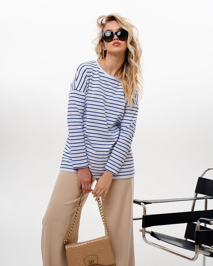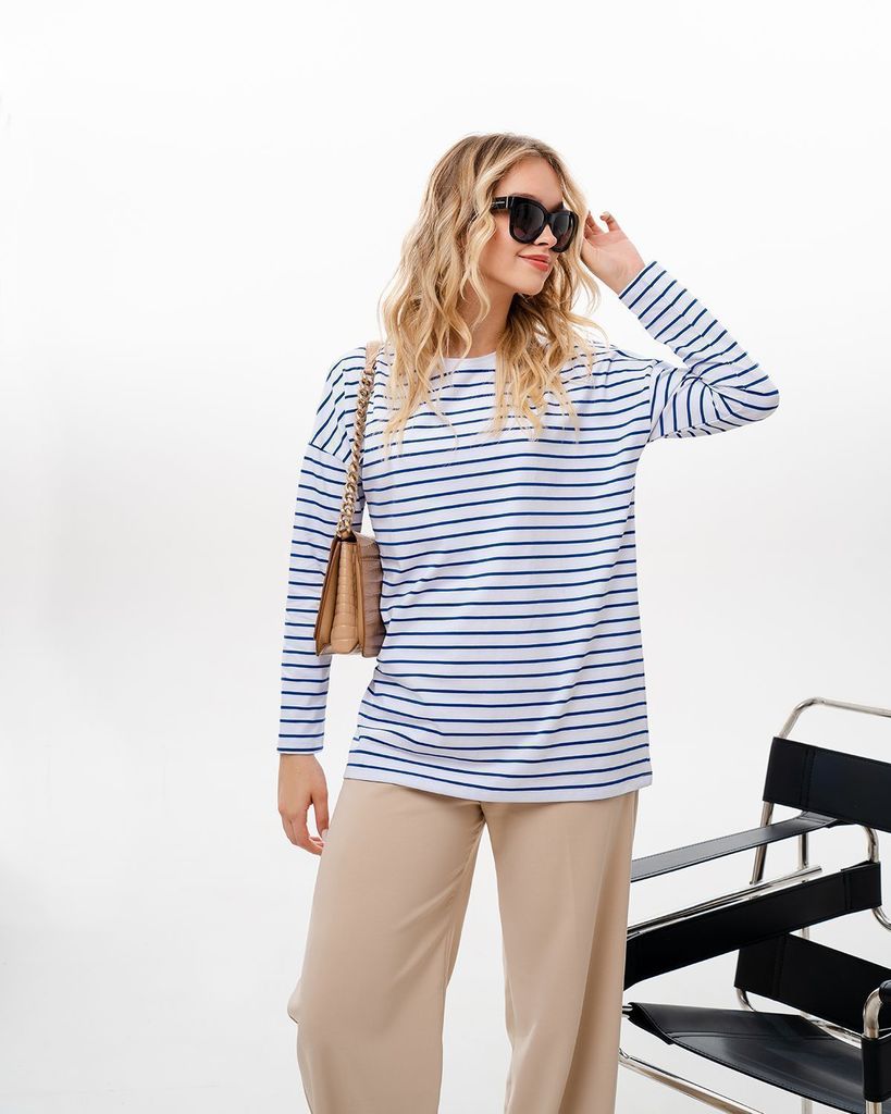 Базовый лонгслив в полоску — легкая модель для создания расслабленных спокойных образов. Сделан он из приятной для тела хлопковой кулирки. Это ткань, которая дышит, гипоаллергенна и не вызывает раздра... Показать описаниежений. Мягкая и эластичная кулирка хорошо переносит стирки и служит долго. Поэтому можете быть уверены, что изделие с вами на несколько сезонов. Поставщиком ткани для нас является Турция. Лонгслив можно выбрать в двух вариантах: с надписью на груди или без неё. Изделие свободного кроя со спущенной линией плеча идеально садится на любую фигуру. В ней будет комфортно девушкам и с узкими плечами, и с широкими. В базовых вещах особенно важно удобство в мельчайших деталях. Мы уделяем внимание каждому шву, чтобы вы носили изделия с удовольствием и пониманием, что они выглядят идеально не только с лицевой стороны, но и с изнаночной, а ещё не натирают и не создают дискомфорт. Состав: 95% хлопок, 5% лайкра