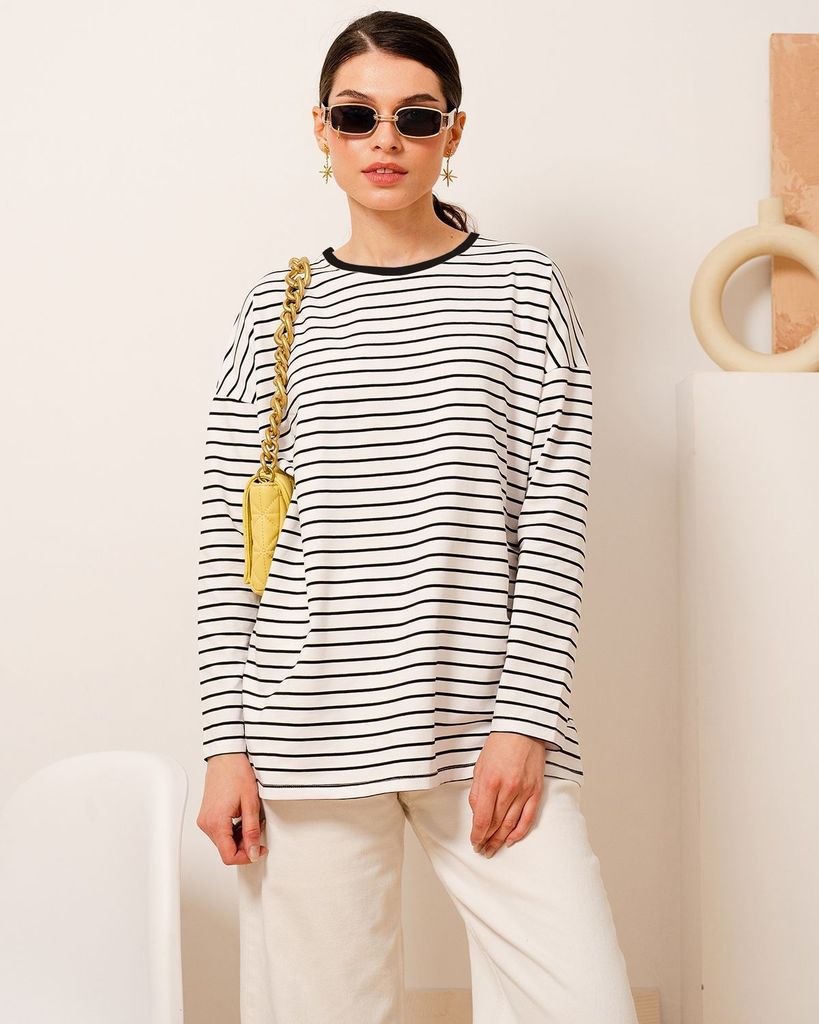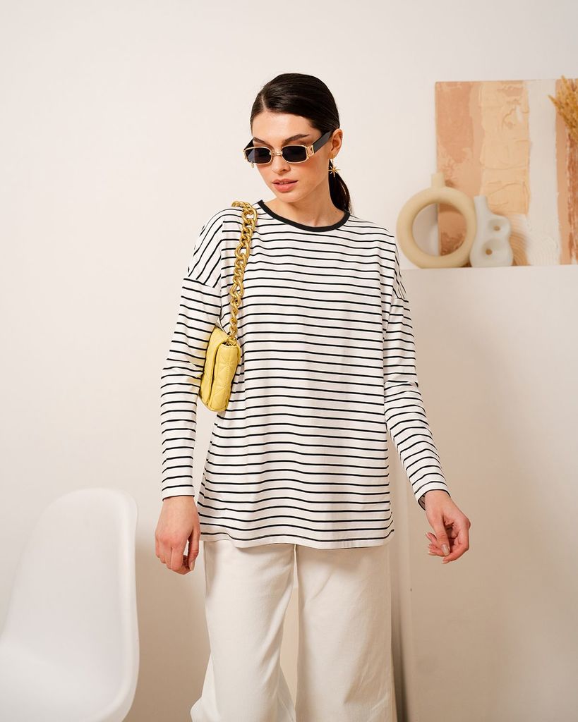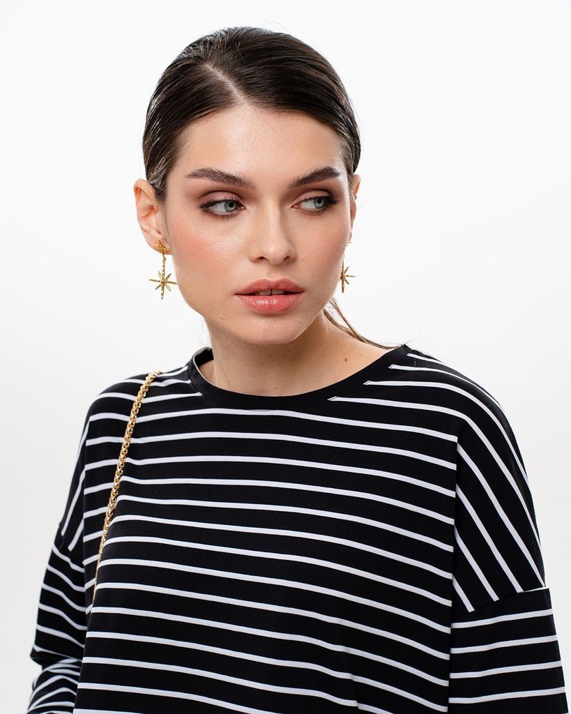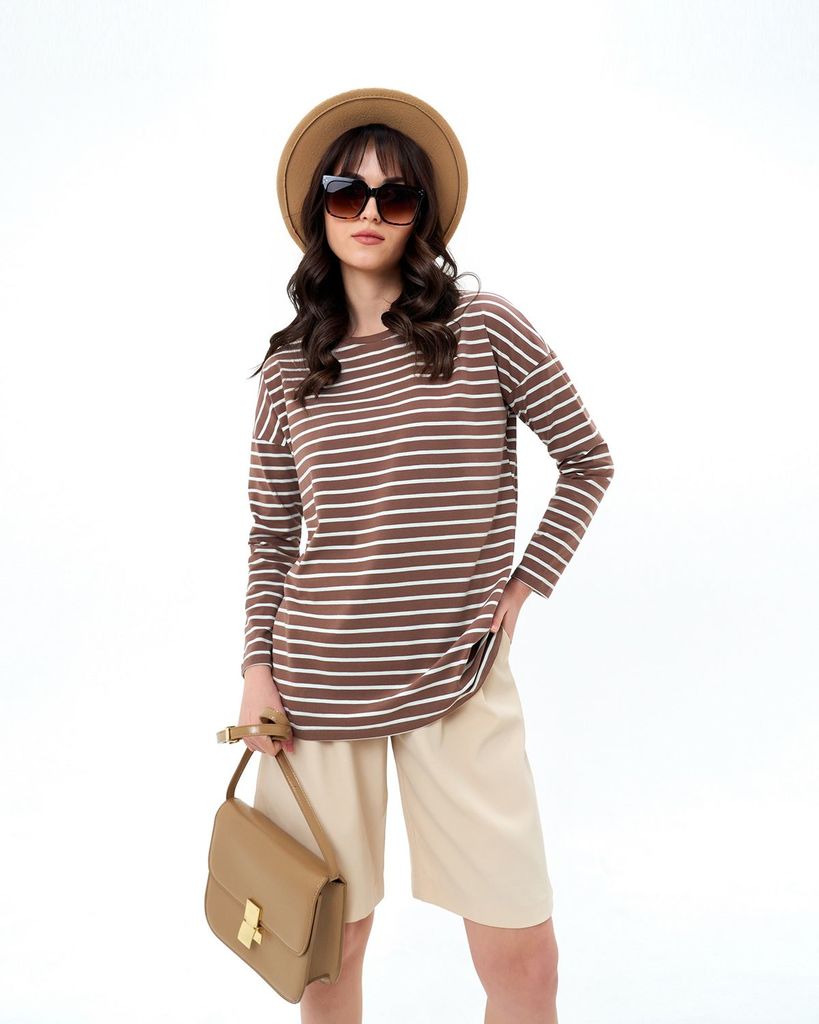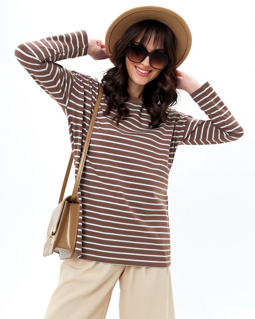 Базовый лонгслив в полоску — легкая модель для создания расслабленных спокойных образов. Сделан он из приятной для тела хлопковой кулирки. Это ткань, которая дышит, гипоаллергенна и не вызывает раздра... Показать описаниежений. Мягкая и эластичная кулирка хорошо переносит стирки и служит долго. Поэтому можете быть уверены, что изделие с вами на несколько сезонов. Поставщиком ткани для нас является Турция. Лонгслив можно выбрать в двух вариантах: с надписью на груди или без неё. Изделие свободного кроя со спущенной линией плеча идеально садится на любую фигуру. В ней будет комфортно девушкам и с узкими плечами, и с широкими. В базовых вещах особенно важно удобство в мельчайших деталях. Мы уделяем внимание каждому шву, чтобы вы носили изделия с удовольствием и пониманием, что они выглядят идеально не только с лицевой стороны, но и с изнаночной, а ещё не натирают и не создают дискомфорт. Состав: 95% хлопок, 5% лайкра