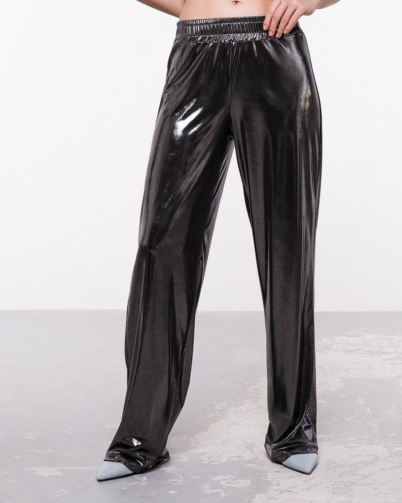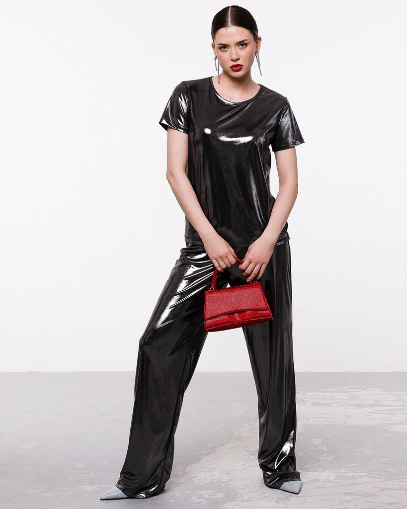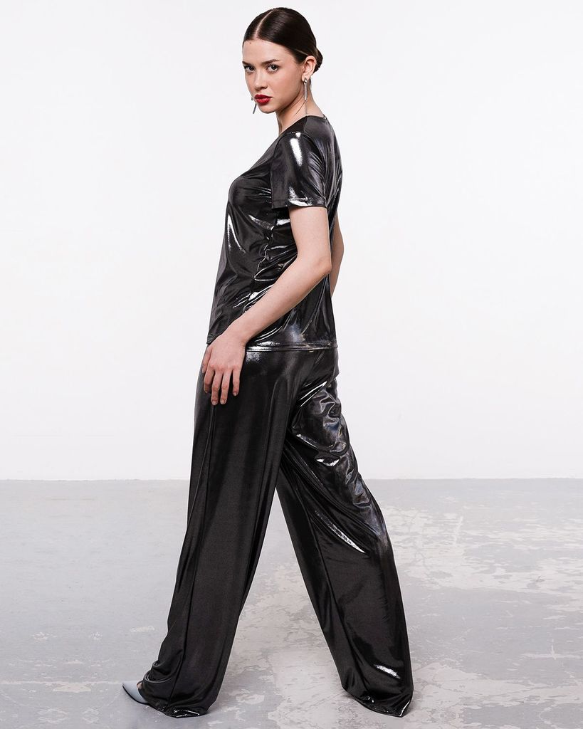 Брюки из материала "жидкий металл" – актуальная модель. Брюки сшиты из блестящей ткани Валенсия. Брюки прямого кроя премиум качества, идеально садятся и выглядят дорого. Высокая посадка выполнена таки... Показать описанием образом, что хорошо скрывает недостатки и визуально стройнит. Высококачественный эластичный материал делает носку классических брюк очень комфортной. Брюки идеально подойдут под спорт шик с кроссовками, а так же под элегантные "шпильки". Брюки сочетаются с разнообразными луками разных стилей: повседневный, прогулочный, кэжуал, офисный и спортивный. К брюкам в комплект вы можете приобрести футболку классического кроя из этой же ткани. Состав: 70% вискоза, 25% полиэстер, 5% лайкра