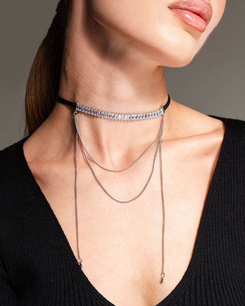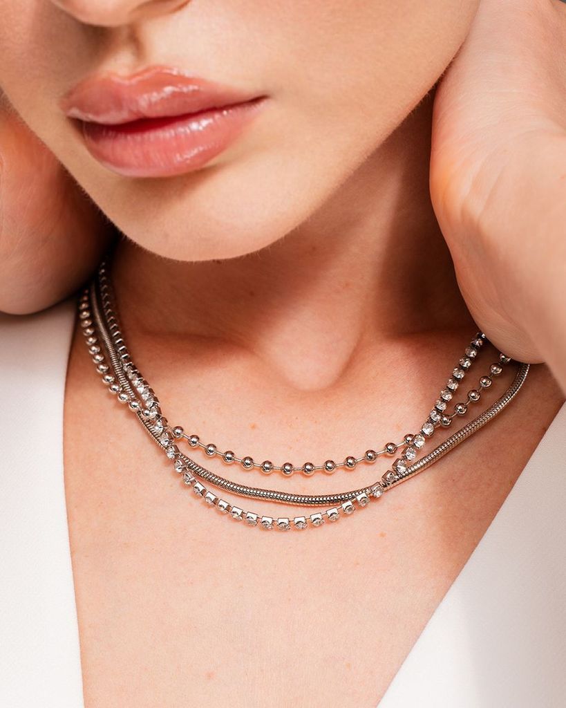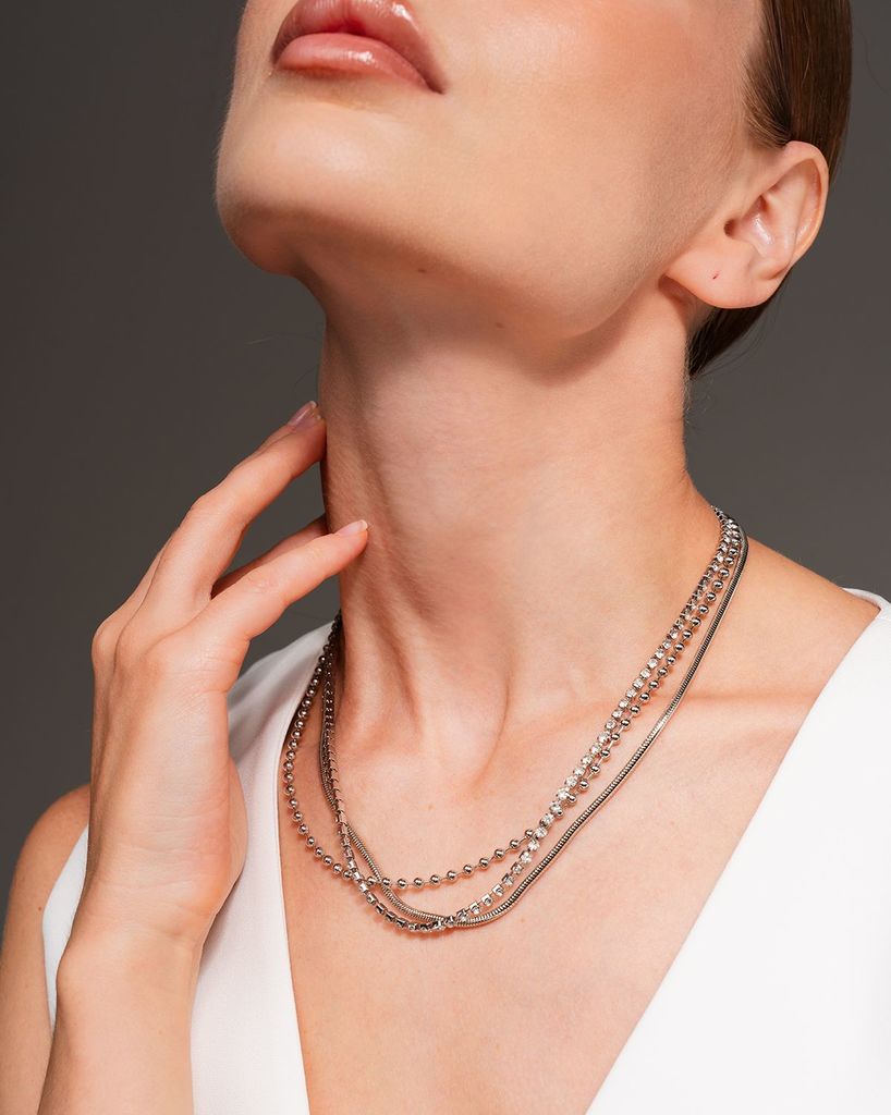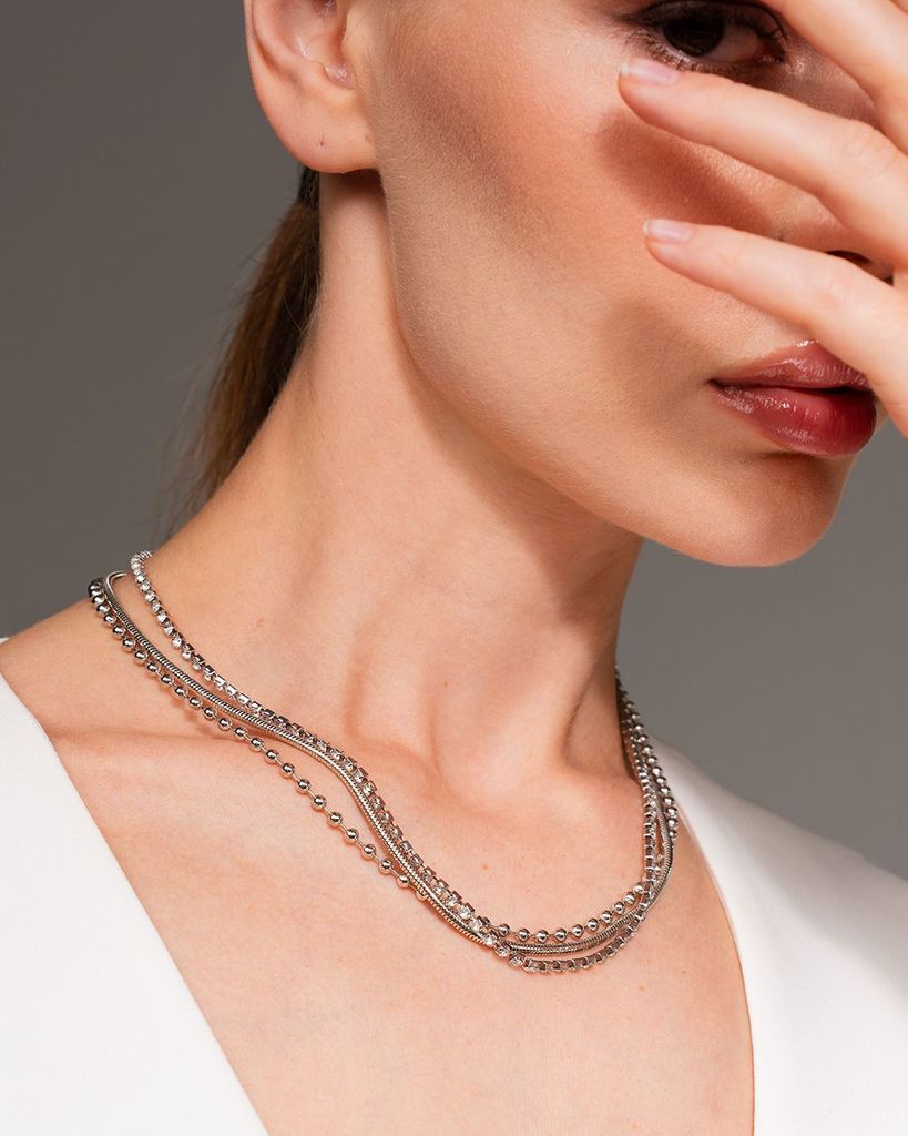 Это колье с тремя цепочками и кристаллами делает стильным любой образ, подойдет как для вечернего выхода, так и повседневной носки. Ожерелье серебряного цвета соответствует последним трендовым веяниям... Показать описание моды, но при этом не противоречит классике, не темнеет со временем. Наши украшения изготавливаются из премиального бижутерного сплава и будут годами радовать вас своим видом. (Избегайте попадания воды, парфюма и кремов на металл). Состав: Бижутерный сплав