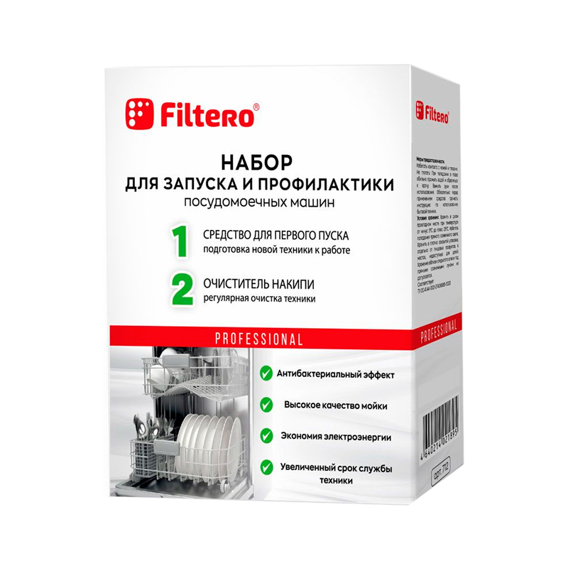 Функциональный набор для правильного старта новой посудомоечной машины с целью получения максимального эффекта при мойке посуды и максимального продления срока службы бытовой техники. В комплект входи... Показать описаниет средство для первого пуска (очищение внутренних деталей стиральной машины от масел, пыли и прочих заводских загрязнений) и антинакипин (удаление твердых отложений солей и защита металлических поверхностей). - Средство первого запуска Filtero - обезжиривает, очищает и освежает новую посудомоечную машину всего за 1 применение. Благодаря улучшенной формуле, можно избежать появления трудновыводимых пятен от технических масел на посуде во время первого пуска. Идеальное решение для подготовки новой техники к ежедневному использованию! Подходит для всех типов и марок посудомоечных машин (ПММ) Отличительные характеристики средства для первого пуска Filtero от аналогов: 1. Удобный формат в виде порошка - гарантия полного растворения. 2. Самый оптимальный объем - 200 г 3. Оптимизированная и улучшенная формула - удаление заводских и технических загязнений за одно применение! 4. Нейтрализует технический запах - гарантия свежести чистого белья без посторонних технических запахов. - Антинакипин от Filtero предназначен для удаления налета, который возникает на нагревательных частях электрических приборов в процессе эксплуатации посудомоечной машины - актуально особенно в регионах с водой средней и высокой жесткостью. Благодаря специальной формуле Filtero (4в1), средство гарантирует глубокую очистку и предохраняет все самые важные элементы от коррозии. Подходит для всех типов посудомоечных машин (ПММ). Отличительные характеристики антинакипина Filtero (4в1) от аналогов: 1. Растворяет самые застарелые образования солей кальция и магния на ТЭНах без вреда для внутренних элементов ПММ - эффективное и безопасное удаление известкового налета 2. Очищает от жира и грязи, накипи и мыльного налета даже в скрытых местах и трубах - глубокая очистка труднодоступных мест. 3. Убирает едкие и кислые запахи, не оставляя отдушки химии на стенках ПММ - полная нейтрализация неприятных запахов. 4. Обеспечивает гигиеническую чистоту посудомоечной машины, формируя устойчивый антибактериальный эффект. Регулярное использование очистителя от накипи Filtero позволяет посудомоечной машине работать на полную мощность, качественно отмывать на посуде даже стойкие загрязнения, существенно снижая расход электроэнергии: - Защищает посуду от появления белых подтеков и пятен; - Уменьшает время нагрева воды и экономит электричество; - Увеличивает срок службы ПММ и защищает пластиковые детали от хрупкости. При отсутствии специального антинакипина для ПММ - слой известкового налета со временем и совершенно незаметно увеличивается, что снижает качество мойки посуды, увеличивает время нагрева воды (потребление электроэнергии), разрушает металлические и пластиковые детали машины (сокращается срок службы машин). Запустите новую стиральную машину с проверенным средством при первом пуске от Filtero и продлите жизнь свой бытовой техники с антинакипином Filtero на многие годы: - Удобный формат средства в виде порошка - гарантия полного растворения. - Оптимизированная и улучшенная формула. Первый пуск: >30% хлорид натрия; 5 – 15% сульфат натрия, карбонат натрия, триполифосфат натрия, <