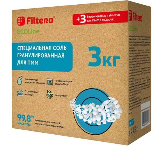 Соль для посудомоечных машин ПММ специальная гранулированная ECOLine от Filtero - правильный выбор для повышения эффективности применяемых моющих средств и продления срока службы посудомоечной машины!... Показать описание Соль для посудомоечной машины линии ЭКО от Filtero подходит для всех типов посудомоечных машин и предназначена для смягчения воды, защиты ПММ от вредных известковых отложений, улучшения качества мытья посуды и предотвращения появления подтеков. Соль гранулированная для посудомоечной машины Filtero ECOLine - специальная, очищенная соль гранулами белого цвета, без посторонних запахов и примесей! 1. Обеспечивает правильную работу ПММ: необходима для очистки водопроводной воды от кальция и магния с помощью ионообменника. 2. Защищает ПММ от накипи: предотвращает накопление извести на ТЭНах, что позволяет ПММ работать на полную мощь и более эффективно. 3. Улучшает действие моющих средств: в мягкой воде отличный результат достигается уже с первого раза и без повторной мойки. 4. Предотвращает появления пятен и разводов: усиливает блеск посуды, что делает её идеальным дополнением к моющим средствам. Рекомендации по необходимости использования специальной гранулированной соли для посудомоечной машины ECOLine от Filtero: 1. Образование накипи на ТЭНе и форсунках в посудомоечной машине. 2. Не удовлетворяет качество вымытой посуды. 3. Наличие на вымытой посуде белого/серого налета. 4. Наличие на вымытой посуде подтеков и разводов. 5. Неэффективная работа ионообменника. Соль Filtero ECOLine гранулированная специально разработана для посудомоечных машин и обладает следующими отличительными особенностями: 1. Глубокая степень очистки: нет риска засорения ионообменника вредными примесями! 2. Крупные гранулы и плотная структура соли: одной заправки хватает на несколько циклов! 3. Соль полностью смывается водой, не оставляя следов и подтеков! 4. Без фосфатов, хлора и красителей: подходит для домов со септиками и безопасна для микрофлоры сточных вод! 5. Экономия для потребителя: соль в большой упаковке, +3 бесфосфатные таблетки в подарок! 6. Дополнительная упаковка соли в пакет: защищает от сырости, препятствует комкованию и слеживанию! 7. Удобство использования: соль расфасована по 1,5 кг, исключает необходимость поднимать тяжелую коробку, а сама коробка оснащена удобной ручкой для транспортировки! 8. Пройдена экологическая сертификация в системе добровольной сертификации в области экологической безопасности. Соль от Filtero ECOline для ПММ гранулированная специальная при регулярном использовании существенно повышает качество мойки посуды и продлевает срок службы посудомоечной машины на многие годы! Рекомендации по применению соли для ПММ от Filtero: Уберите нижнюю корзину, чтобы открыть доступ к резервуару для соли. Открутите крышку и проверьте наличие воды. Насыпать соль через воронку согласно инструкции. Если объем добавляемой соли не указан - необходимо заполнить отсек полностью. Закройте резервуар крышкой и закрутите ее потуже. Верните нижнюю корзину на место, добавьте моющее средство в специально предназначенный отсек и включите посудомоечную машину.