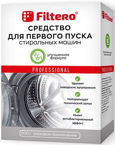 Эффективное средство для очищения внутренних деталей стиральных машин (СМ) от масел, пыли и прочих заводских загрязнений при первом запуске. Многофункциональное средство от Filtero обезжиривает, очища... Показать описаниеет и освежает новую стиральную машину всего за 1 применение. Благодаря улучшенной формуле, можно избежать появления трудновыводимых пятен от технических масел на постиранном белье во время первого пуска. Идеальное решение для подготовки новой техники к ежедневному использованию! Подходит для всех типов и марок стиральных машин (СМ). Отличительные характеристики средства для первого пуска Filtero от аналогов: 1. Удобный формат в виде порошка - гарантия полного растворения. 2. Самый оптимальный объем - 200 г 3. Оптимизированная и улучшенная формула - удаление заводских и технических загрязнений за одно применение! Состав: >30% хлорид натрия; 5 – 15% сульфат натрия, карбонат натрия, триполифосфат натрия, <5% комплексообразователи, НПАВ 4. Нейтрализует технический запах - гарантия свежести чистого белья без посторонних заводских запахов. Рекомендации по применению: Убедитесь, что в стиральной машине нет белья. Содержимое пакета засыпьте в контейнер для порошка. Оставшуюся часть порошка высыпьте непосредственно в барабан стиральной машины. Включите программу стирки на 60С. Дайте программе отработать до конца. Выбирайте средство первого пуска для стиральной машины (СП) от Filtero, чтобы радоваться чистоте и свежести простиранного белья многие годы!