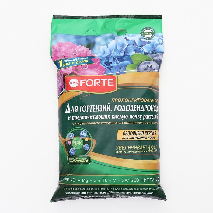 Удобрение для Гортензий, рододендронов и предпочитающих кислую почву растений произведено по уникальной передовой технологии SIIOG - гранулированные удобрения с высоким содержанием биодоступного кремн... Показать описаниеия. Каждая гранула содержит сложный комплекс макроэлементов (азот, фосфор, калий) и биодоступный кремний, подобранный индивидуально для каждой культуры, а также магний, серу, комплекс микроэлементов в легкоусвояемой форме, витамины и янтарную кислоту. ПРОЛОНГИРОВАННОЕ ДЕЙСТВИЕ - достаточно внесения удобрения 1 раз в сезон. Питательные вещества высвобождаются постепенно и усваиваются растениями по мере потребности. УНИКАЛЬНЫЙ СОСТАВ - NPK, Si, S, микрозлементы, витамины и янтарная кислота. Равномерное внесение - содержание всех компонентов в одной грануле обеспечивает 100% попадание каждого элемента питания растению. Азот, фосфор, калий (NPK) - основные макроэлементы питания для обеспечения жизнедеятельности растений. Азот (N) необходим для активного стимулирования роста листьев. Фосфор (P) для пышного и продолжительного цветения.