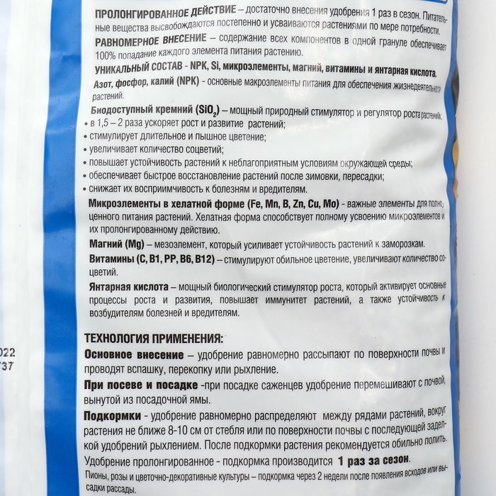 ПРОЛОНГИРОВАННОЕ ДЕЙСТВИЕ - Достаточно внесения удобрения 1 раз в сезон. Питательные вещества высвобождаются постепенно и усваиваются растениями по мере потребности, РАВНОМЕРНОЕ ВНЕСЕНИЕ - содержание ... Показать описаниевсех компонентов в одной грануле обеспечивает 100% попадание каждого элемента питания растению. УНИКАЛЬНЫЙ СОСТАВ - NPK, Si, микроэлементы, магний, витамины и янтарная кислота. Азот, фосфор, калий (NPK) - основные макроэлементы питания для обеспечения жизнедеятельк растений. Биодоступный кремний (SiO,) - мощный природный стимулятор и регулятор ростарастеней. • в 1,5 - 2 раза ускоряет рост и развитие растений; • стимулирует длительное и пышное цветение; • увеличивает количество соцветий; • повышает устойчивость растений к неблагоприятным условиям окружающей среды; • обеспечивает быстрое восстановление растений после зимовки, пересадки; • снижает их восприимчивость к болезням и вредителям. Микроэлементы в хелатной форме (Fe, Mn, B, Zn, Cu, Mo) - важные элементы для полнк ценного питания растений. Хелатная форма способствует полному усвоению микроэлементов и их пролонгированному действию. Магний (Mg) - мезоэлемент, который усиливает устойчивость растений к заморозкам. Витамины (С, B1, PP, B6, B12) - стимулируют обильное цветение, увеличивают количество соцветий. Янтарная кислота - мощный биологический стимулятор роста, который активирует основные процессы роста и развития, повышает иммунитет растений, а также устойчивость к возбудителям болезней и вредителям.