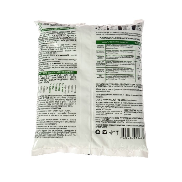 Селитра кальциевая (нитрат кальция) с комплексом микроэлементов - водорастворимое удобрение для подкормок овощных, цветочно-декоративных и плодовых культур. Способствует улучшению вкусовых качеств пло... Показать описаниедов и ягод; повышению сопротивляемости растений к неблагоприятным условиям; увеличению урожайности. Состав: NN - 17%, CaO - 32%, B - 0,03%, Cu - 0,15%, Fe - 0,09%, Mn - 0,16%, Mo - 0,002%, Zn - 0,04%.