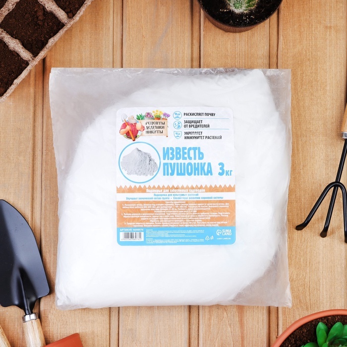 Видео Известь-пушонка Известь-пушонка — эффективное минеральное удобрение для нормализации кислотности почвы. Натуральный продукт улучшает структуру грунта и создает благоприятные условия для роста ра... Показать описаниестений. Основные преимущества: * Регулирует pH почвы: Оптимизирует кислотно-щелочной баланс, создавая идеальные условия для большинства садовых культур * Универсальное применение: Подходит для использования весной и осенью на огороде, в саду и цветниках * Безопасный состав: Относится к 4 классу опасности (малоопасные вещества) * Экономичный расход: 1 кг достаточно для обработки 5-7 кв.м площади * Улучшает плодородие: Способствует лучшему усвоению растениями питательных веществ из почвы * Многофункциональность: Может использоваться для побелки деревьев и борьбы с вредителями Характеристики: Вес: 3 кг Форма: сухая смесь Срок годности: не ограничен Условия хранения: в сухом месте Способ применения: 1. Для раскисления почвы равномерно распределите 150-200 г на 1 кв.м и перекопайте на глубину 15-20 см 2. Для побелки деревьев разведите с водой в пропорции 1:3 3. Для защиты растений от вредителей используйте в сухом виде или в виде раствора Рекомендуем дополнительно: Для комплексного улучшения почвы сочетайте с органическими удобрениями здесь или минеральными подкормками здесь.