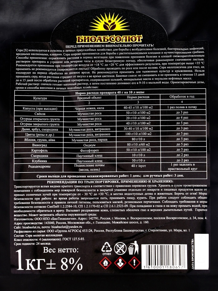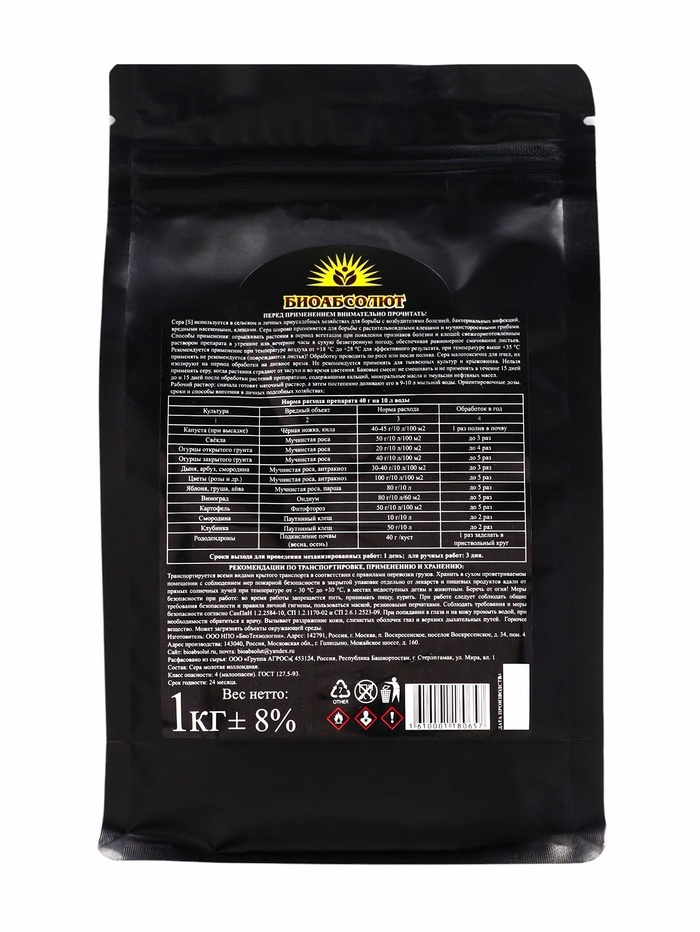 Сера коллоидная. Фунгицид, инсектоакарицид. Порошок • От насекомых вредителей • Повышает кислотность почвы • От болезней растений Сера [S] используется в сельском и личных приусадебных хозяйствах для ... Показать описаниеборьбы с возбудителями болезней, бактериальных инфекций, вредными насекомыми, клещами. Сера широко применяется для борьбы с растительноядными клещами и мучнисторосяными грибами. Способы применения: опрыскивать растения период вегетации при появлении признаков болезни и клещей свежеприготовленным раствором препарата утренние или вечерние часы в сухую безветренную погоду, обеспечивая равномерное смачивание листьев. Рекомендуется применение при температуре воздуха от +18°С до +28°С для эффективного результата, при температуре выше +35 °C применять не рекомендуется (повреждаются листья)! Обработку проводить по росе или после полива. Сера малотоксична для пчел, их изолируют на период обработки на дневное время. Не рекомендуется применять для тыквенных культур и крыжовника. Нельзя применять серу, когда растения страдают от засухи и во время цветения. Баковые смеси: не смешивать и не применять в течение 15 дней до и 15 дней после обработки растений препаратами, содержащими кальций, минеральные масла и эмульсии нефтяных масел. Рабочий раствор: сначала готовят маточный раствор, а затем постепенно доливают его в 9-10 л мыльной воды. Ориентировочные дозы, сроки и способы внесения в личных подсобных хозяйствах: см. на упаковке