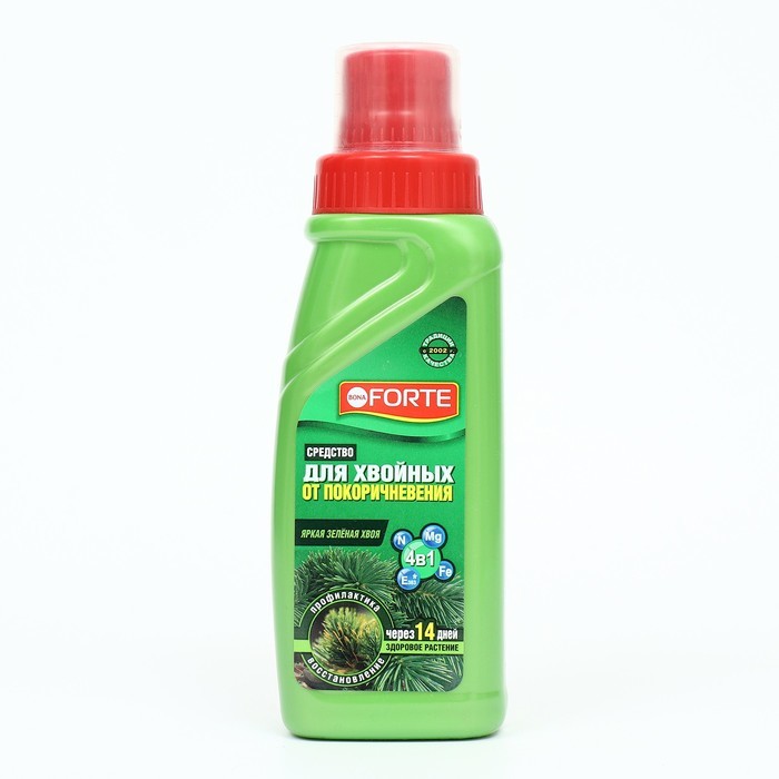 ПРЕИМУЩЕСТВА КОМПОНЕНТОВ СОСТАВА Обогащено минеральными добавками: - обеспечивает яркую зеленую хвою; - предотвращает и снимает хлороз; - стимулирует темп развития растения; - препятствует покоричневе... Показать описаниению. *Янтарная кислота (E 363) - помогает растению справиться с неблагоприятными природными условиями, в том числе с грибными инфекциями (шютте, серая гниль, фузариоз), которые портят хвою. Способ применения: При применении во флаконе с триггером отмерьте 5 мл концентрата и разведите в 1 литре воды. При использовании в опры- скивателе отмерьте 25 мл и разведите в 5 литрах воды. Опрыскивайте хвою до полного смачивания. У высоких взрослых растений можно опрыскать только нижнюю часть кроны, до которой возможно дотянуться. Не опрыскивать растения под прямыми солнечными лучами. Период применения: март - октябрь 1 раз в неделю. Рекомендации специалистов: Применение средства от покоричневения наиболее эффективно при совместном использовании с жидкими или сухими удобрениями Bona Forte. СОСТАВ: вода - 30% и более, минеральные добавки - 15% или более, но менее 30%; янтарная кислота - менее 5%, витамины - менее 5%, неионогенное ПАВ - менее 5%.