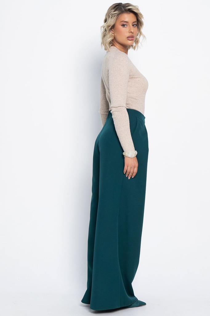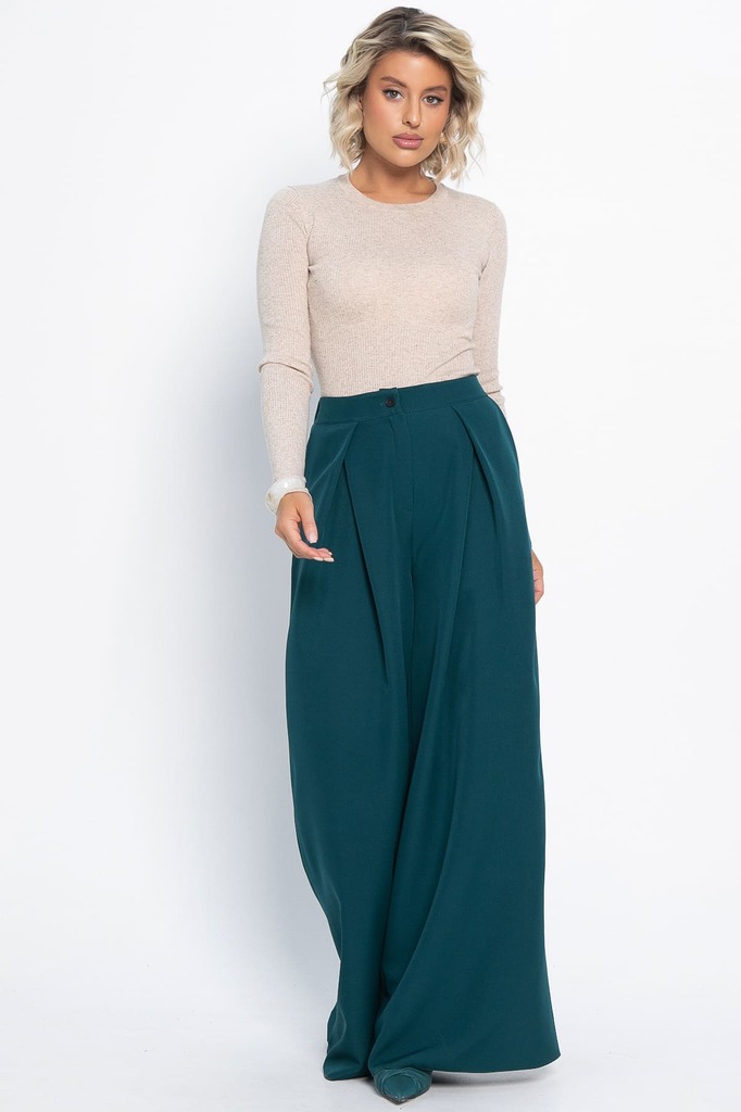 Состав : 95% полиэстер, 5% эластан Материал : вискоза костюмная Цвет : зеленый Принт : отсутствует Карманы : есть Резинка в поясе : да Вид застежки : молния и пуговица Тип посадки брюк : средняя Пояс ... Показать описаниебрюк : втачной Крой брюк : свободный Фасон брюк : классические Декоративные элементы : отсутствуют Обхват бёдер : 44 - 122, 46 - 128, 48 - 132, 50 - 136, 52 - 140 Обхват талии : 44 - 68, 46 - 72, 48 - 78, 50 - 82, 52 - 86 Длина готового изделия по внутреннему шву : 44-80 см, 46-80 см, 48-80 см, 50-81 см, 52-81 см Длина готового изделия по боковому шву : 44-111 см, 46-111 см, 48-111 см, 50-112 см, 52-112 см Классические широкие брюки-палаццо в красивом изумрудном цвете — идеальный выбор для модниц, ценящих комфорт и элегантность. Эти брюки идеально подходят как для повседневной носки, так и для особых мероприятий, что делает их универсальным элементом гардероба. Спинка на резинке для удобной и комфортной посадки, а спереди встречные складки придают им стильный вид. Свободный фасон брюк гармонично сочетается с различными верхами, позволяя создавать разнообразные образы — от casual до более формальных. Добавьте эти брюки-палаццо в свой гардероб и наслаждайтесь стильными и комфортными нарядами! Внимание! Рекомендуем ориентироваться на размерную сетку и выбирать свой привычный размер, согласно размерной таблице. *Допуск отклонения длины при массовом производстве 1-3 см является нормой. Уход за изделием: Ручная стирка или стирка в машине при температуре до 30 °C, деликатный режим. Не использовать отбеливатели. Разрешена глажка при температуре до 110 °C. При глажке использовать специальную насадку на подошве утюга, гладить с паром. Не замачивать и не выжимать. Стирать изделие наизнанку, отдельно от других вещей.