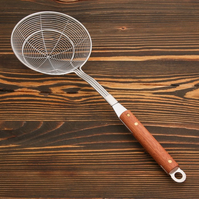 Дуршлаг-сито Шафран, d=13 см, глубина 3.5 см, длина 41 см, с деревянной ручкой, металлВопросы по товару