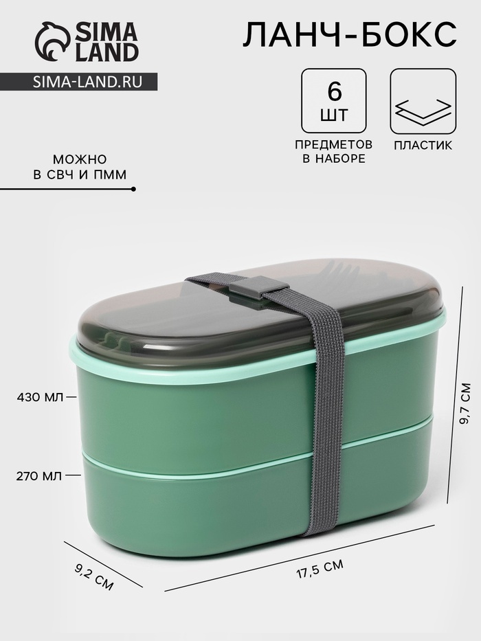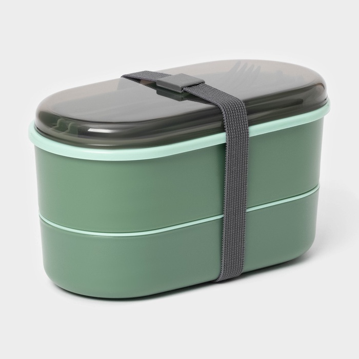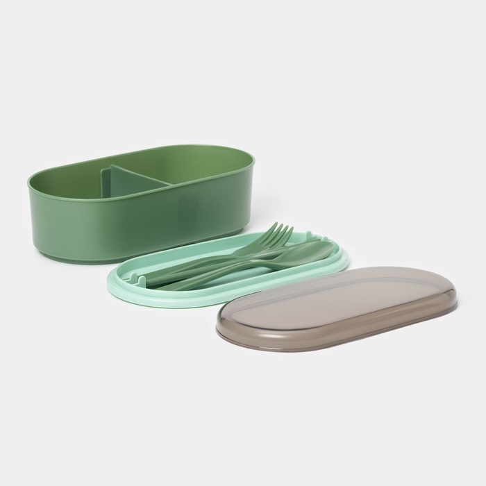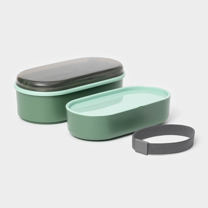 Ланч - бокс для еды двухуровневый с крышкой «Милитари», 17.5?9.2?6 см, 430 мл, 270 мл, столовые приборы, пластик, зелёныйВопросы по товару