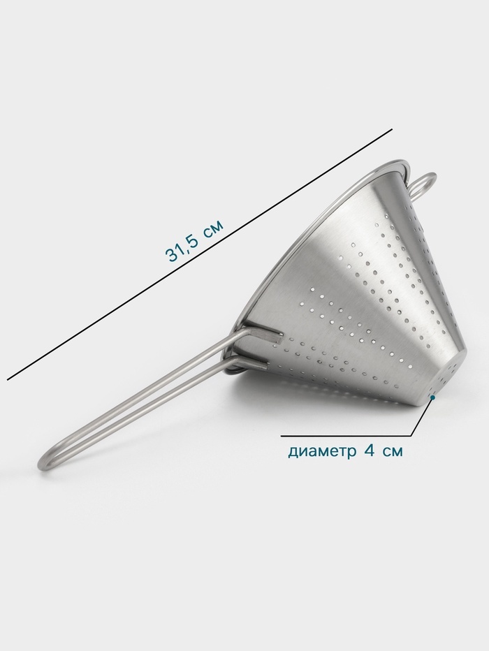 Упростите процесс приготовления вместе с коническим дуршлагом, который станет незаменимым помощником на вашей кухне. Его компактный диаметр в 18 см позволяет легко справляться с различными задачами, о... Показать описаниет слива воды до промывания продуктов. Преимущества * Эффективное слияние: конусообразная форма обеспечивает быстрое и равномерное сливание жидкости. * Премиум материал: изготовлен из нержавеющей стали, что гарантирует долговечность и устойчивость к коррозии. Легко чистится и подходит для мытья в посудомоечной машине. * Современный дизайн: серебристый цвет и стильный вид делают его не только функциональным, но и эстетически привлекательным элементом на кухне. С этим дуршлагом вы сможете быстро и без лишних усилий готовить любимые блюда. Добавьте его в свою кухонную утварь и наслаждайтесь процессом готовки! Дополнительно Диаметр отверстий 2 мм.