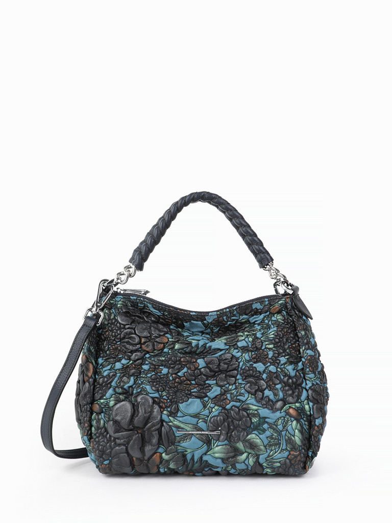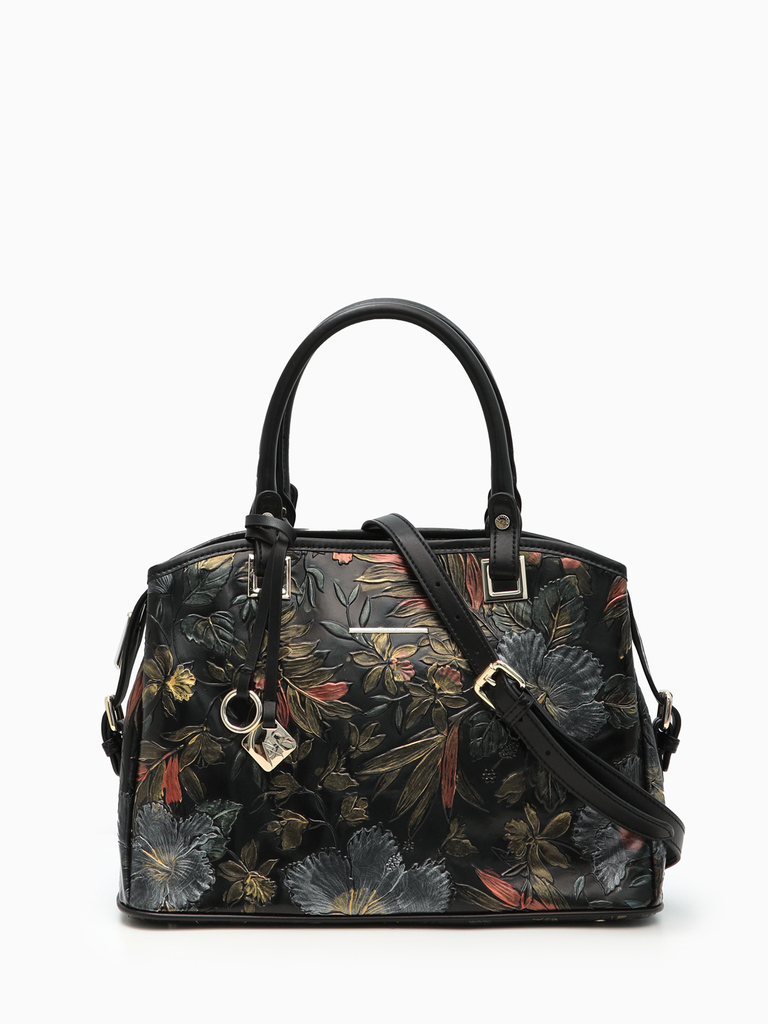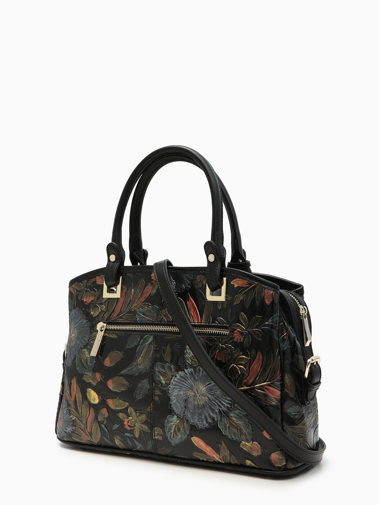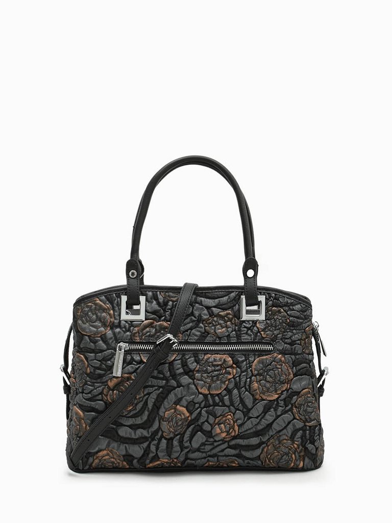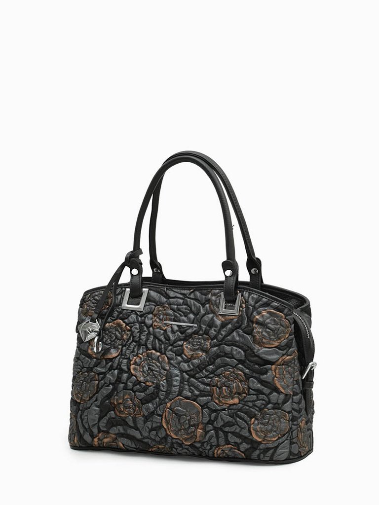 Тоут от Alessandro Beato из натуральной кожи черного цвета с объемным тиснением и цветочным принтом Длина сумочки Алессандро Беато (Alessandro Beato) - 34 см (по дну), 30 см (по верхнему краю), ... Показать описаниеширина по дну - 13 см, высота - 23,5 см, общая высота с ручками - 39 см. Сумочка состоит из трех автономных отделений, центральное закрывается на молнию, боковые на магнитные кнопки. Внутри центральное отделение на молнии, сбоку карман на молнии, карманы для мелочей. Сумочка носится на плече, на сгибе руки или в руке. Прилагается длинный регулируемый ремешок на плечо, максимальная длина - 120 см.
