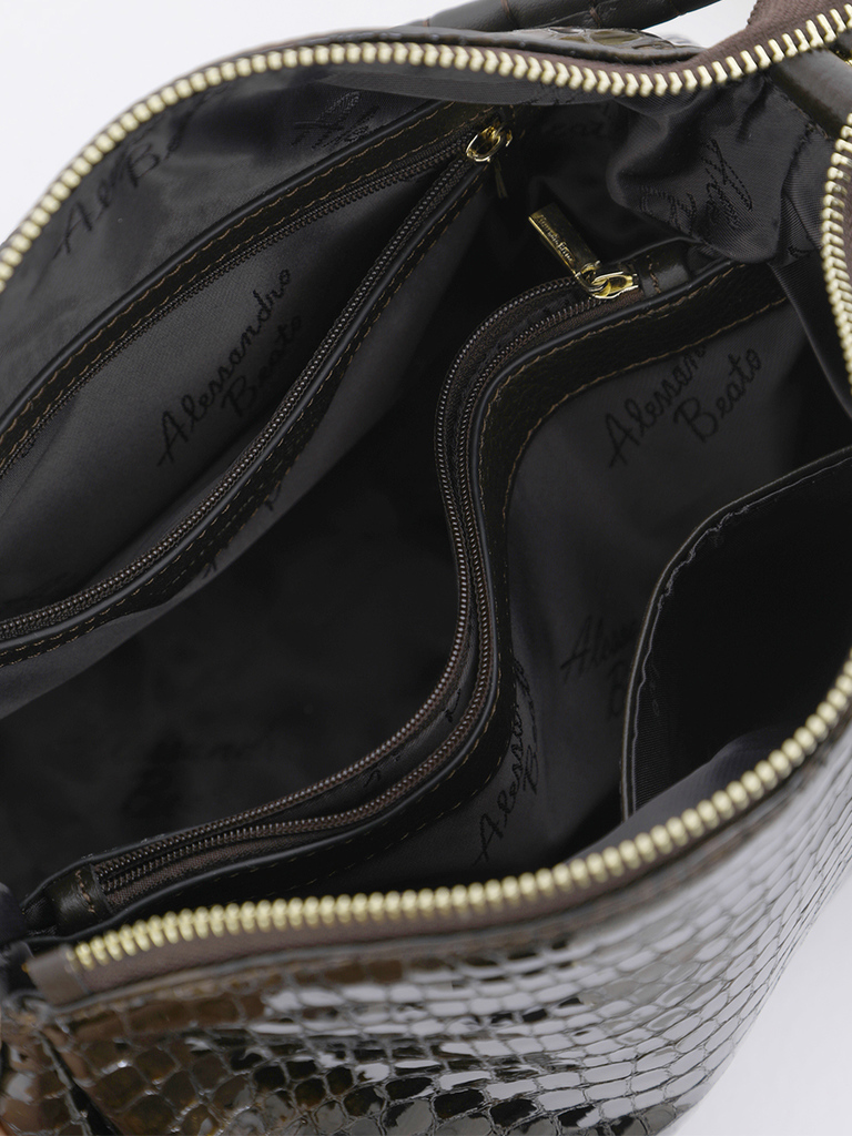 Кросс-боди от Alessandro Beato из натуральной лаковой кожи в коричневом цвете Длина сумки Алессандро Беато (Alessandro Beato) - 27 см, ширина по дну - 15 см, высота - 24 см, общая высота - 35 см. Сумк... Показать описаниеа закрывается на молнию. Внутри центральное отделение на молнии, сбоку карман на молнии, карманы для мелочей. Снаружи сзади карман на молнии. Сумка носится в руке или через плечо. Длина ремешка регулируется. Лёгкая и комфортная модель!