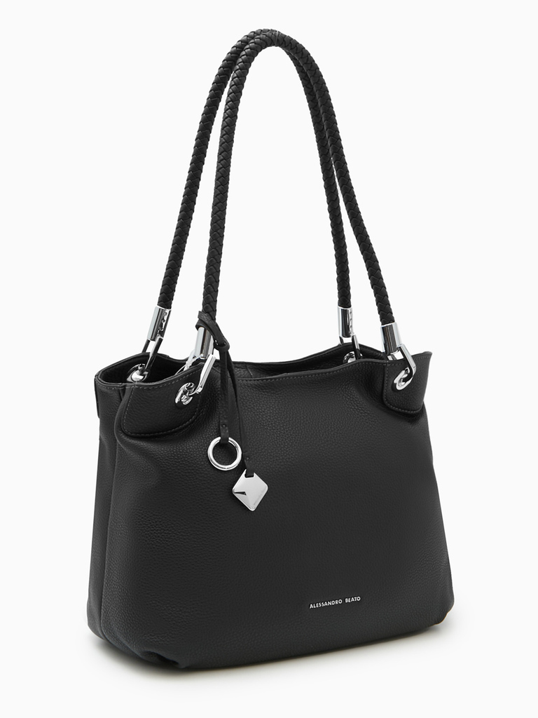 Шоппер с длинными плетёными ручками от Alessandro Beato из натуральной кожи черного цвета Длина сумки Алессандро Беато (Alessandro Beato) - 33 (30) см, ширина по дну - 15 см, высота - 27 см, общая выс... Показать описаниеота - 57 см. Сумочка выполнена из буклированной кожи - хит продаж этого и прошлых сезонов! Сумочка закрывается на молнию. Внутри центральное отделение на молнии, сбоку карман на молнии, карманы для мелочей. Снаружи сзади карман на молнии. Сумочка носится на плече.
