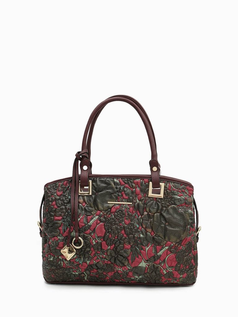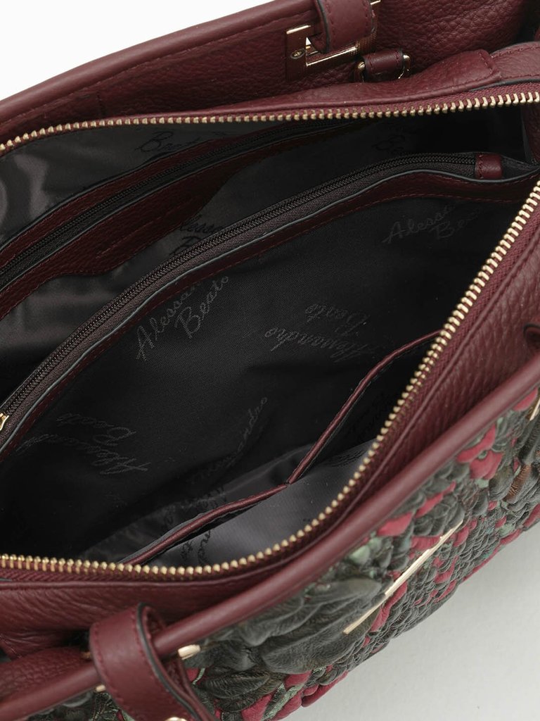 Тоут от Alessandro Beato из натуральной кожи букле бордового цвета с цветочным принтом Длина сумочки Алессандро Беато (Alessandro Beato) - 34 см (по дну), 30 см (по верхнему краю), ширина по дну... Показать описание - 13 см, высота - 23,5 см, общая высота с ручками - 39 см. Сумочка состоит из трех автономных отделений, центральное закрывается на молнию, боковые на магнитные кнопки. Внутри центральное отделение на молнии, сбоку карман на молнии, карманы для мелочей. Сумочка носится на плече, на сгибе руки или в руке. Прилагается длинный регулируемый ремешок на плечо, максимальная длина - 120 см.