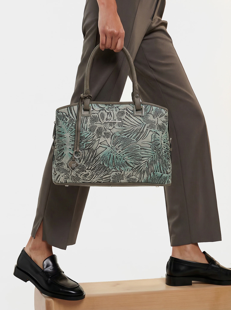 Классическая сумка-тоут со съёмным брелоком и цветочным тиснением от Alessandro Beato в зелёном оттенке petrolio Материал: натуральная кожа Размеры: Длина по дну: 35 см Длина по верхнему краю: 30 см Ш... Показать описаниеирина по дну: 14 см Высота: 25,5 см Общая высота с ручками: 46 см Описание: Классическая сумка-тоут от итальянского бренда Alessandro Beato выполнена из натуральной буклированной 3D кожи, декорирована съёмным металлическим брелоком и узорным цветочным тиснением. Данная модель состоит из трех автономных отделений, центральное закрывается на молнию, носится на плече, на сгибе руки или в руке Внутри: боковой карман для документов на молнии, карманы для мелочей Снаружи: на дне металлические ножки Производитель: Alessandro Beato, Италия Расположение производства: Китай
